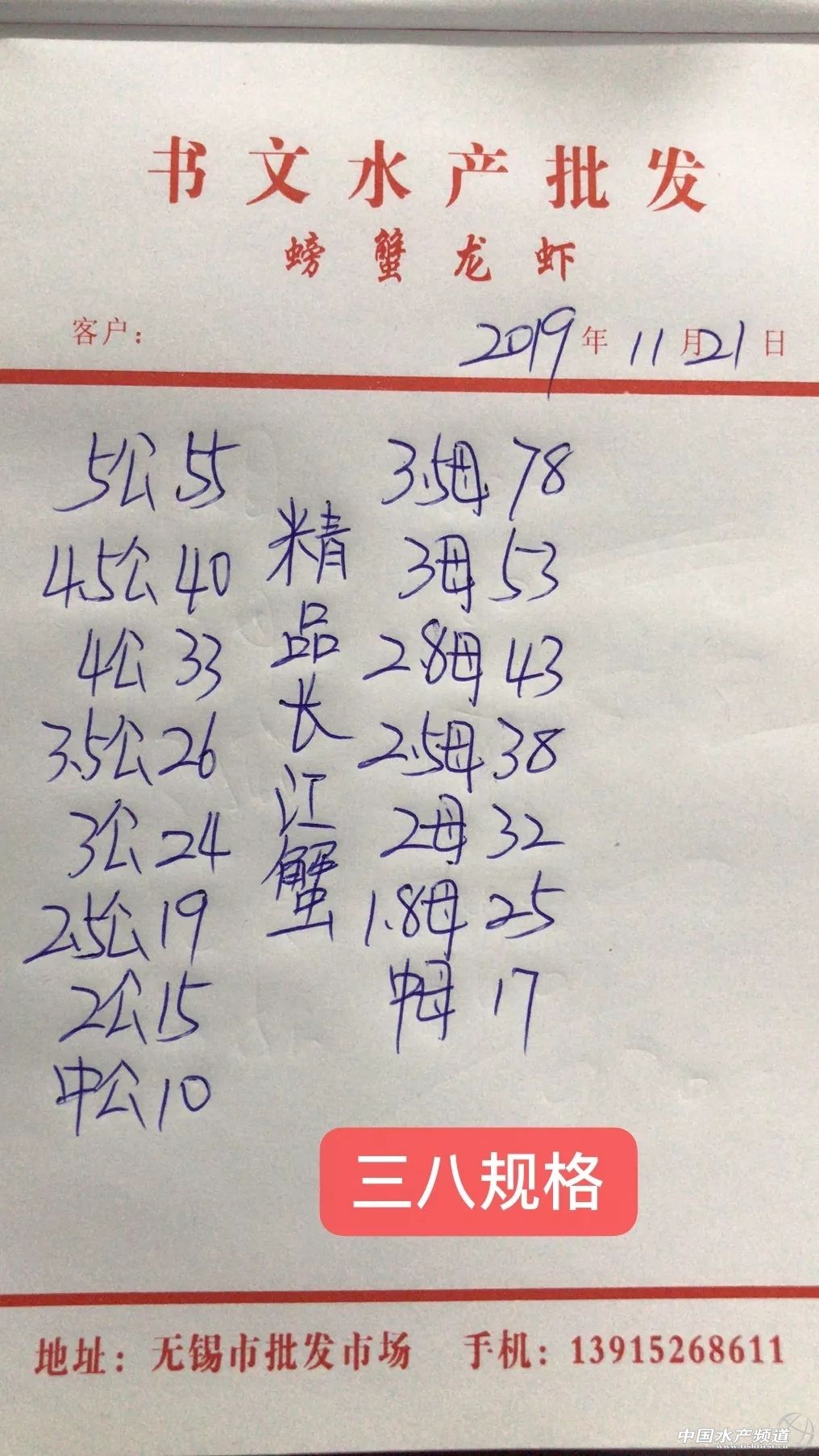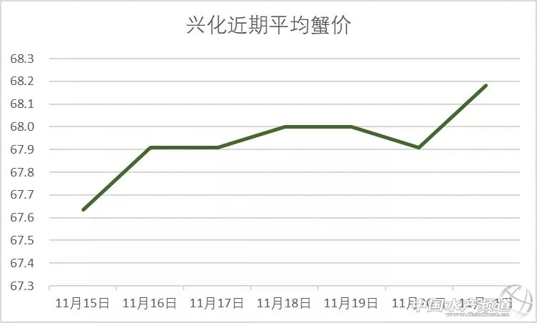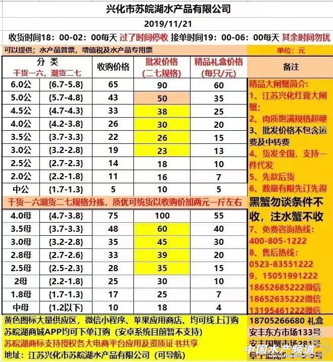 | 中國水產頻道原創報道, 興化整體上漲。 蝦蟹行情每日播報 您身邊的行情顧問 歡迎關注蝦蟹前沿公眾號! 最新行情解析 高淳 近期高淳精品蟹價整體呈上漲趨勢,不過今天略有下跌,目前平均蟹價為47.2元/斤。與去年同期相比,目前蟹價仍明顯偏低。 今天高淳精品門市4公、2.5母、2母均跌1元/斤,其他規格蟹價未變。 興化 近期興化精挑蟹價整體呈上漲趨勢,今天略有上漲,其中5公漲2元/斤,4公漲1元/斤。同時,今天興化市場指導價普挑、普貨價格均有所上漲。 今日參考價 興化 此報價由江蘇好潤馬家蕩店宋利坤提供 此報價由江蘇好潤馬家蕩店宋利坤提供 高淳 此報價由江蘇好潤固城湖店劉坤提供 泗洪 此報價由泗洪孫老板提供 無錫 此報價由無錫王老板提供 宣城 |