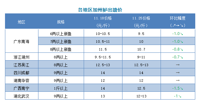 | 中國水產頻道原創報道, 文/圖 何氏水產、水產前沿 李靜 加州鱸 本周除江蘇吳江、四川成都、湖南華容價格保持穩定外,其它產區都有0.5-1.5元/斤不等的跌幅。 1、本周廣東鱸魚價格呈穩中有降趨勢,本周新魚8兩上開塘價在10.7元/斤,跌了0.8元/斤;6兩上開塘價9.5元/斤,比上周下跌了1元/斤;7兩以上價格是10元/斤,比上周也下跌了1元/斤。現在鱸魚大魚頭存塘比例越來越多了,現在大部分養戶都選擇出大規格魚為主,實際塘頭價格根據魚頭大小和規格比例來定。目前價格未達到部分養戶預期,不少養戶觀望惜售,出魚積極性不高。 2、浙江湖州鱸魚價格比上周下跌了0.5元/斤,8兩以上價格是9-11元/斤,具體價格要看魚頭大小和規格成數而定,當地養戶出魚積極性較高,以出統貨為主。江蘇吳江、湖南華容本周價格保持穩定。目前價格未達到養戶心理預期,加上當地習慣養老魚,大部分養戶還在觀望,目前出魚量不大。廣西南寧、湖北武漢本周價格都有所下跌,其中廣西南寧下跌了1.5元/斤,報價是12.5元/斤,本地部分養戶想天氣轉冷前出魚減少損耗,現魚量相比上周有所增加;湖北武漢下跌了1元/斤,報價是12-13元/斤,本地新魚上市量不大,尤其是大規格魚較少。 |