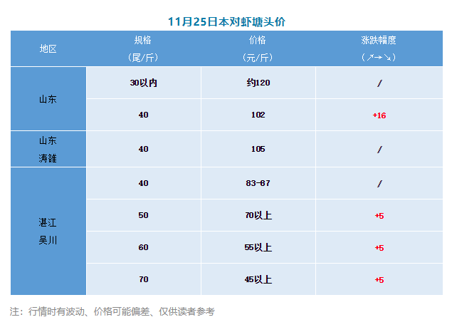 | 中國水產頻道原創報道, 全線漲價!本周羅氏沼蝦、斑節對蝦、日本對蝦行情報價 文/ 水產前沿 何鴻浩 本周行情 1、山東日本對蝦再漲16元/斤,突破100元大關 本周多地日本對蝦上漲顯著,湛江地區40條規格突破80元,山東地區40條規格突破100元。其中山東地區增長最為明顯,暴漲16元/斤,當地業者表示花蝦受市場歡迎,且近來降溫,運輸成功率高,所以價格回到正常價位。 2、海南斑節對蝦上漲快速 多地斑節對蝦已經售罄,蝦中到處找蝦。近來水產商行表示,多數收到廣東地區及海南地區的斑節對蝦,但價格在迅速攀升,其中海南地區增長非常明顯。目前,海南地區斑節對蝦也開始收縮,部分養殖戶選擇惜售或者存塘到12月。 3、羅氏沼蝦價格持續上漲 多地羅氏沼蝦已經售罄,羅氏沼蝦市場價格較為穩定,部分區域小幅度上漲或下降,屬于正常市場調控。 羅氏沼蝦 羅氏沼蝦 斑節對蝦 斑節對蝦 日本對蝦 |