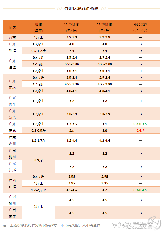 | 中國水產頻道原創報道, 目前存塘魚減少,業者認為今后漲價有望 文/ 水產前沿 葉豐齊 海南地區:羅非魚行情穩定保持,1斤以上規格3.7-3.9元/斤。 珠三角地區:加工廠訂單減少,珠海0.6-1斤規格進加工廠羅非(廠非)3.4元/斤,同上周價格;1.2斤以上規格走市場羅非(市場非)約4元/斤,同上周;東莞1.2-2斤以上規格市場非4.1元/斤,環比上周下跌0.2-0.4元/斤;0.5-0.9斤規格中非2.6-3元/斤(0.7-0.99斤范圍3元/斤),環比上周上漲0.4元/斤;業內人士認為天氣冷,肉價貴,讓家庭增加中非消費,拉升了價格,大規格羅非較適宜多人聚餐消費,反而沒那么走量;恩平1.5斤以上規格市場非約4.2元/斤,同上周;1斤上廠非3.5元/斤,同上周,目前存塘魚減少,業者認為今后漲價有望;新興抓1.3斤以上市場非,始終爛市難出,到手價3.8-3.9元/斤,同上周行情。 粵東地區:惠州1.2-1.8斤規格市場非約4.3-4.4元/斤,同上周,養戶反映最近較難出魚;揭陽9兩以上進凍廠規格廠非3.2元/斤,汕尾9兩以上進凍廠規格廠非3.2元/斤,皆同上周價格;汕尾和海豐1斤以上規格市場非約4元/斤,同上周行情。 粵西地區:湛江、茂名兩地1.6-2斤以上規格市場非約4-4.1元/斤,同上周;加工廠依然偏好小規格羅非,0.6-1斤規格塘頭價約2.9-3.0元/斤,最高可達3.4元/斤(3成3.1元/斤、4成3.25元/斤、5成3.4元/斤),和上周行情一致;兩地1-1.6斤規格廠非約3.75-3.80元/斤(1.6斤以上魚超3成減0.1元/斤、超4成減0.2元/斤,以此類推),同上周價格。 廣西地區:北海廠非0.6-1斤規格2.95元/斤,1斤上廠非約3.95元/斤(大規格3.85元/斤,超大規格2.95元/斤),同上周價格;1.2-2斤以上規格市場非拖網4.2元/斤左右,環比上周下跌0.3-0.4元/斤;南寧和柳州清塘出魚,1.2-1.5斤左右規格市場非約4.5元/斤,維持上周行情。 |
