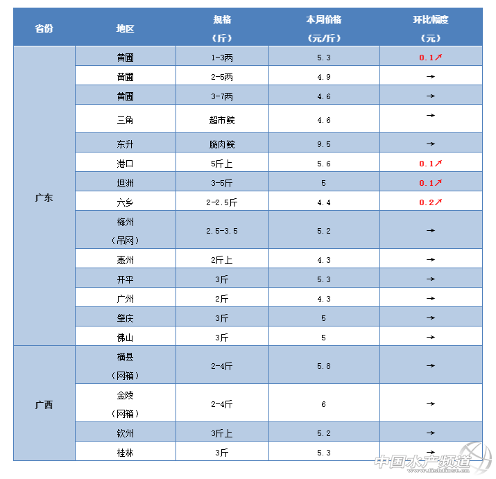 | 中國水產頻道原創報道, 草魚爛市結束未?豬肉又漲價了!多個水產品現大漲,冷空氣持續拉動終端消費,接下來草魚會漲嗎? 文/ 水產前沿 鄭鵬飛 一周要聞 2019年馬上就要接近尾聲了,目前淡水魚的行情整體上還是低迷,大部分品種仍然呈現下滑趨勢。最近,多地加州鱸下滑0.5元/斤,生魚最高跌0.7元/斤,黃顙魚最高暴跌2.2元/斤。雖然冷空氣活動越來越頻繁,目前大半個中國都基本被凍到瑟瑟發抖了,但是草魚行情卻還是繼續保持“淡定”,暫時沒有出現明顯的好轉,局部市場依然還是很爛市。 據了解,目前河北唐山地區3斤的草魚最新塘頭價在4.5元/斤左右,有部分地區最低賣到4.3元/斤。養殖戶表示,目前山東萊州地區個別小池塘3斤多的草魚只賣到4塊多點。四川成都市場上外地的草魚很多,草魚爛市,4-5斤的草魚都只賣到4塊多點。近期東北地區降溫是最明顯的,但是目前遼寧沈陽地區草魚行情還是基本一動不動,3斤以上的草魚最新塘頭價基本維持在4.5-4.6元/斤,丹東地區3-5斤的草魚賣4.7-4.8元/斤,6-8斤的賣5.1-5.2元/斤。據業內人士介紹,最近江蘇高郵地區鯽魚和花鰱的價格再次出現下滑。 年關將近,豬肉擋不住漲價!12月2日,全國生豬價格整體呈現上漲態勢,不少地區屠宰企業結算價上漲幅度在1元/公斤以上,部分區域企業結算價上漲幅度在2元/公斤。(來自農牧前沿) 據了解,最近的冷空氣對豬肉的終端消費起到了明顯的拉動作用,昨天多地生豬價格出現大漲,河南地區生豬價格最高暴漲1.7元/公斤,部分區域企業結算價上漲幅度在2元/公斤。最近部分水產品也是出現明顯上漲。其中,廣東的鱖魚暴漲2元/斤,日本對蝦最高賣到125元/斤,多地大規格小龍蝦批發價突破40元/斤,本周華南地區的草魚行情總算有一點好轉的跡象了。從流通商了解到,最近廣東中山地區1-3兩的草魚苗最新塘頭價賣5.3元/斤,上漲0.1元/斤,局部地區超市鯇和統鯇也是有上漲的趨勢。接下來草魚行情能否真正出現好轉嗯?歡迎留言分享! 一周行情 華南地區 中山:本周華南地區的草魚行情總算是開始有一點好轉的跡象了。雖然目前中山大部分地區2-3斤的草魚塘頭價還是只有4.7元/斤。但是有流通商表示,最近草魚行情總算是有點好轉了,有部分地區的最新塘頭價較之前已經有1毛錢的上漲,目前1-3兩的草魚苗種最新塘頭價賣到5.3元/斤,較上周也是上漲了0.1元/斤。 廣州:最近廣州地區的草魚行情還是繼續保持穩定,目前2斤以上的草魚塘頭價基本維持在4.3-4.4元/斤。 肇慶:從養殖戶了解到,肇慶地區的草魚還是沒有出現明顯波動,目前3斤的草魚最新塘頭價賣5-5.3元/斤。 廣西:本周廣西的草魚行情整體上還是沒有出現太大變化。目前廣西桂林地區3斤的草魚塘頭價還是繼續維持在5.3元/斤左右,養殖戶表示暫時草魚行情還是沒有見漲,上漲可能要等到元旦了。 華中地區 湖南:本周湖南的草魚行情有漲有跌。據了解,目前常德地區2-2.5斤的草魚塘頭賣3.8-4.1元/斤,3斤的草魚塘頭基本還是賣4塊多點,有部分地區草魚行情繼續有小幅下跌。目前1-1.2斤的鳊魚賣4.5-4.8元/斤,0.5以的鯽魚賣5.5-6元/斤,3斤以上的花鰱賣5.8-6.3元/斤,2斤以上的白鰱賣1.8-2.1元/斤。長沙地區3斤的草魚只賣到3.9元/斤,3斤以上的價格略微好一點,但依然不高,8兩以上的鯽魚還是只賣到4元/斤左右。不過,同時我們了解到最近安鄉地區草魚走量開始逐漸增多,3斤以上的草魚已經可以賣到4.7元/斤了,行情有上漲的趨勢。 湖北:本周湖北地區的草魚還是沒有出現太大變化,塘頭價基本維持在上周水平。據了解,目前武漢白沙洲市場3斤的還是只賣到3.8-4元/斤,養殖戶表示暫時行情還是不見好轉。從養殖戶了解到,最近洪湖地區的草魚行情也還是沒有出現上漲跡象,目前2斤的草魚塘頭賣4.1元/斤,3斤以上多賣4.3元/斤。 江西:本周江西地區的草魚行情整體上還是比較低迷,局部地區最新塘頭價相比之前仍有小幅下滑。據養殖戶接受啊,目前江西南昌地區3斤左右的草魚最新塘頭價還是維持在4.1-4.2元/斤,有部分地區較上周再次出現0.1元/斤的下滑,最新塘頭價賣4.1元/斤。 河南:本周河南地區的草魚行情整體上還是保持穩定,暫時沒有出現上漲跡象。據從養殖戶了解到,目前鄭州地區3斤以上的草魚塘頭賣4.6元/斤,暫時沒有出現明顯波動。 華東地區 江蘇:本周華東地區的魚價整體行情也是是沒有好轉,多個品種繼續有下滑趨勢。從業內人士了解到,最近江蘇高郵地區的草魚最新塘頭價基本還是保持穩定,目前還沒有好轉,但是最近鯽魚和花鰱的價格再次出現下滑。目前泰州地區3斤的草魚塘頭也只賣到4.4元/斤左右,暫時也是沒有太大變化。 福建:本周福建地區的草魚塘頭價基本維持上周水平,沒有出現明顯波動。從養殖戶了解到,目前閩江地區3斤的網箱草魚最新報價在5.4元/斤左右,三明地區3斤的草魚最新塘頭價賣5.2元/斤,繼續都保持上周水平。 其他地區 東北地區:雖然近期東北地區降溫非常明顯,但是目前的魚價行情卻暫時還是沒有出現明顯的好轉。從養殖戶了解到,目前遼寧沈陽地區3斤以上的草魚最新塘頭價還是繼續維持在4.5-4.6元/斤,暫時還是沒有出現明顯變化。丹東地區3-5斤的草魚賣4.7-4.8元/斤,6-8斤的賣5.1-5.2元/斤。 華北地區:本周華北地區的草魚行情也是繼續保持穩定。據養殖戶介紹,目前河北唐山地區3斤的草魚最新塘頭價在4.5-4.6元/斤,8兩以上的鯽魚賣6元/斤,有部分地