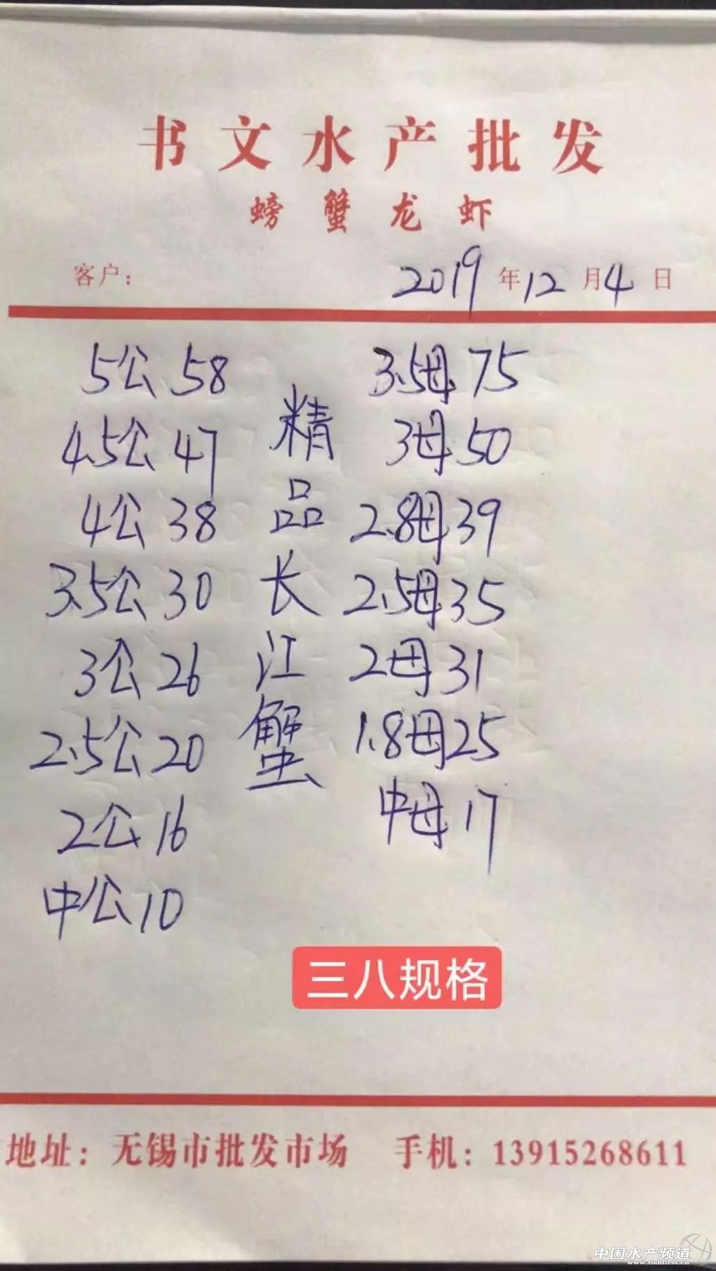 | 中國水產頻道原創報道, 最新河蟹行情解析 高淳 近期高淳精品蟹價波動較為明顯,今天蟹價小幅下滑。與去年同期相比,目前蟹價明顯偏低。今天高淳精品門市5公、4.5公均跌2元/斤,2.5母、2母均漲1元/斤,其他規格蟹價未變。 今日河蟹參考價 興化 此報價由江蘇好潤馬家蕩店宋利坤提供 高淳 此報價由江蘇好潤固城湖店劉坤提供 泗洪 此報價由泗洪孫老板提供 無錫 此報價由無錫王老板提供 宣城 |