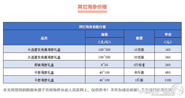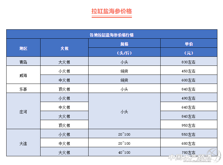 | 中國水產(chǎn)頻道原創(chuàng)報道, 文/ 水產(chǎn)前沿實習編輯 賀志義 一周行情 對于今年海參手撿苗的整體行情,總體來說,今年前期選擇觀望的養(yǎng)殖戶較多,前期價格稍低,但是抓苗量較少。但是隨著冷空氣的來襲,海參回礁抓苗難度增加,海參縮水,然后苗價連續(xù)上漲,抓苗量反而隨之上漲,甚至抓了一些低質(zhì)量的苗種。到底今年苗價低還是高?一切的謎底都將于明年4月份揭曉。 目前,各地海參手撿苗已經(jīng)結(jié)束或者即將結(jié)束,筆者將從本周開始提供部分成品海參的報價,同時現(xiàn)在也是海參消費的高峰期,價格僅供大家參考。通過持續(xù)的關(guān)注成品海參的價格,發(fā)現(xiàn)成品海參價格相對比較穩(wěn)定。 |