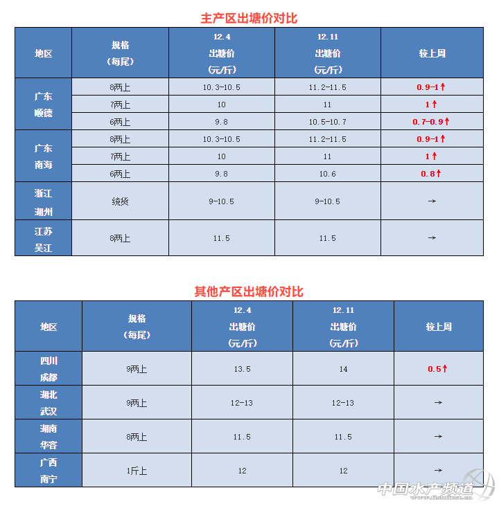 | 中國水產頻道原創報道, 文/圖 杰大飼料 水產前沿 李曉欣 聯合發布 本周,廣東佛山迎來了上漲好消息!今天,佛山8兩上加州鱸報價11.2-11.5元/斤左右,相比上周價格漲了0.9-1元/斤。據悉,由于魚價未達預期,佛山當地不少養戶惜售心理增強,而近期天氣轉冷后外省魚車赴廣收魚增多,流通商為提高養戶出魚積極性而小幅多次上調了魚價。受廣東魚價回升影響,成都加州鱸也上漲了0.5元/斤,其他產區加州鱸價格基本保持平穩。 今日各地加州鱸塘頭價及本周行情分析 廣東順徳:今天報價6兩上10.5-10.7元/斤左右,7兩上11元/斤左右,8兩上11.2-11.5元/斤左右,實際價格看每塘魚魚頭大小而定。受氣溫影響,本周外省魚車收魚量有所增加,價格比上周有所上升。本周出魚的養殖戶積極性一般,因為前期價格比較理想,今年部分清塘育苗的魚塘比去年有所提前。 廣東南海:今天報價6兩上10.6元/斤左右,7兩上11元/斤左右,8兩上11.2-11.5元/斤左右,實際價格因魚頭大小有所不同。本周魚價明顯回升,以出8兩上規格為主。由于氣溫下降明顯,大多數養殖戶已經出了第二網魚并不著急出魚,觀望情緒依然很濃,目前大規格魚更受市場歡迎,也更有議價空間。 浙江湖州:今天湖州統貨報價9-9.5元/斤,魚價一周持平,目前當地養戶出魚較為積極,以出統貨清塘為主,由于魚價便宜,吸引了不少流通商過來收魚。 江蘇吳江:今天吳江8兩上新魚報價11.5元/斤左右,相比上周價格持穩,目前魚價未達養戶心理價位,加上當地習慣養老口魚,出魚量很少。 四川成都:今天報價9兩上14元/斤,比上周價格升了0.5元/斤,受廣東魚價回升影響,成都魚價有所上升,但大部分養殖戶仍持觀望心態,主要是溫度下降大家看好后市市場。 湖北武漢:本周武漢魚價一周持穩,9兩上報價12-13元/斤,武漢及周邊區域達上市規格的魚不多,出魚量少。 湖南華容:今天華容8兩上鱸魚報價11.5元/斤,價格與上周持平,目前魚價未達預期,華容養戶出魚積極性不高,本地走量不大。 廣西南寧:今天南寧1斤上鱸魚報價12元/斤左右,魚價一周持穩。 |