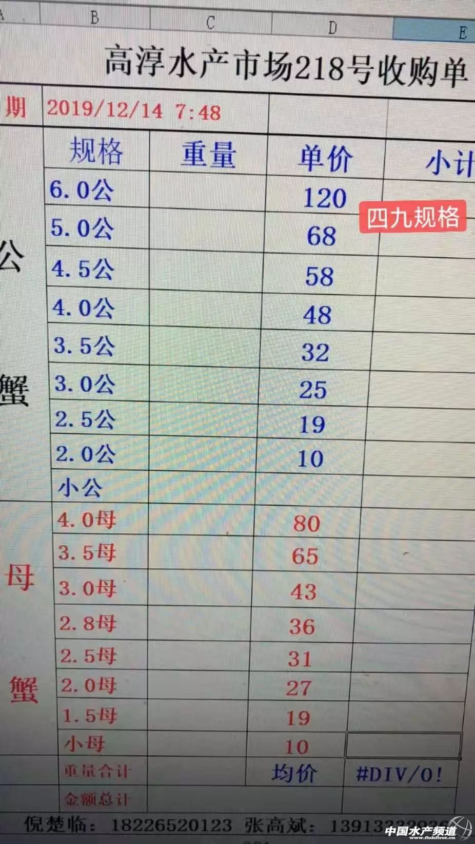 | 中國水產頻道原創報道, 高淳蟹價平穩。 蝦蟹行情每日播報 您身邊的行情顧問 歡迎關注蝦蟹前沿公眾號! 最新行情解析 高淳 近期高淳精品蟹價整體呈下跌趨勢,今天價格保持平穩,各規格蟹價基本未變。與去年同期相比,目前蟹價明顯偏低。 興化 近期興化普蟹價格整體呈下跌趨勢,今天蟹價整體略有上漲。其中3.5公、4公、4.5公、5公、2.5母均漲1元/斤,2公、1.5母均跌1元/斤,其他各規格蟹價基本未變。 今日參考價 興化 此報價由江蘇好潤馬家蕩店宋利坤提供 高淳 此報價由江蘇好潤固城湖店劉坤提供 泗洪 此報價由泗洪孫老板提供 無錫 此報價由無錫王老板提供 宣城 此報價由宣城劉老板提供 上海 |