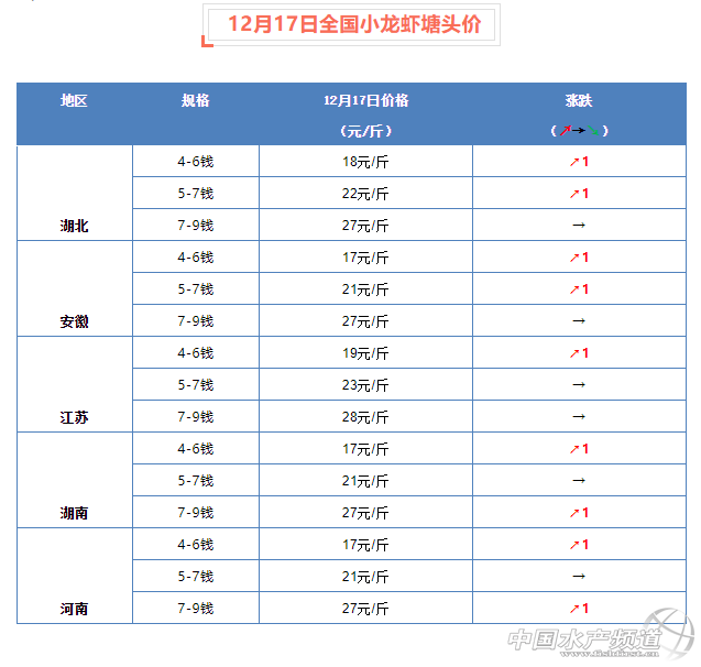 摘要: 中國水產(chǎn)頻道報道,12月17日全國小龍蝦塘頭價。
