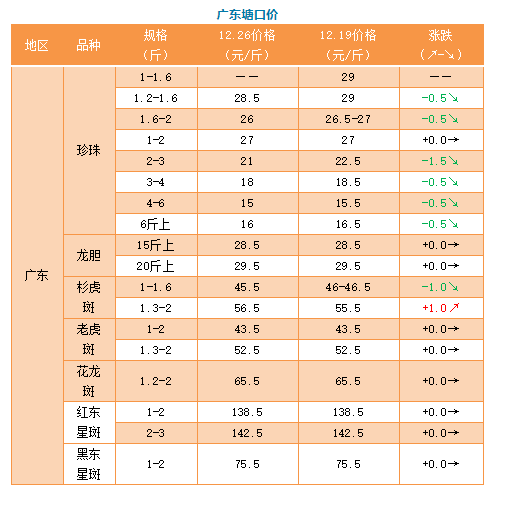 中國水產(chǎn)頻道原創(chuàng)報道, 12月26日海南、廣東、福建、北京石斑魚價格播報 文/水產(chǎn)前沿吳佳輝 行情簡析 海南:這段時間,石斑魚價格持續(xù)低迷,傳統(tǒng)節(jié)假日即將到來,是否有漲價的希望?業(yè)內(nèi)人士表示:由于存塘量還比較大,漲價的希望不高。 成品魚價格 石斑魚苗價格 石斑魚苗:本周海南幾乎沒有小苗,中苗價格也相差無幾。龍膽苗價格則較亂,所以本次周報不做報價。 特別感謝:海南晨海水產(chǎn)有限公司、海南大順發(fā)水產(chǎn)有限公司、萊州明波水產(chǎn)有限公司、廣東上上生物科技有限公司、廣東大順發(fā)水產(chǎn)有限公司、福建藝祺水產(chǎn)養(yǎng)殖有限公司、涌益水產(chǎn)專業(yè)合作社為本文提供價格! 【關(guān)鍵字】:石斑魚 價格行情 水產(chǎn)養(yǎng)殖 |