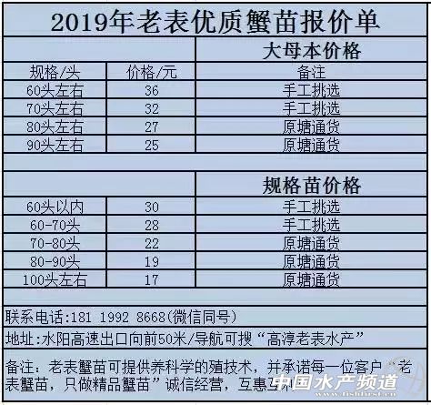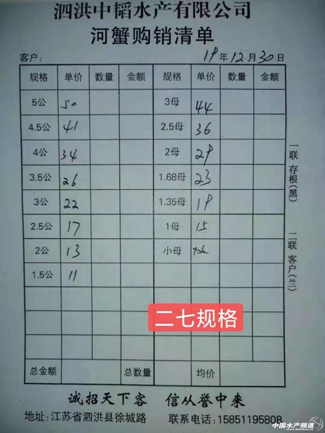 | 中國水產頻道原創報道, 扣蟹參考價 高淳 水陽 盤錦 成蟹行情解析 高淳 近期高淳精品蟹價整體呈上漲趨勢,今天蟹價略有下跌,其中3.5公、3公、2.8母、2母均跌1元/斤。其他各規格蟹價基本未變。與去年同期相比,目前蟹價明顯偏低。 興化 近期興化普蟹價整體先跌后漲,近四天蟹價保持平穩,今天各規格蟹價基本未變。 成蟹參考價 高淳 此報價由高淳倪老板提供 興化 此報價由興化丁老板提供 泗洪 此報價由泗洪孫老板提供 無錫 |