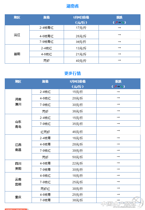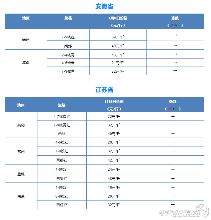 摘要: 中國水產(chǎn)頻道報道,1月8日全國小龍蝦市場批發(fā)價。