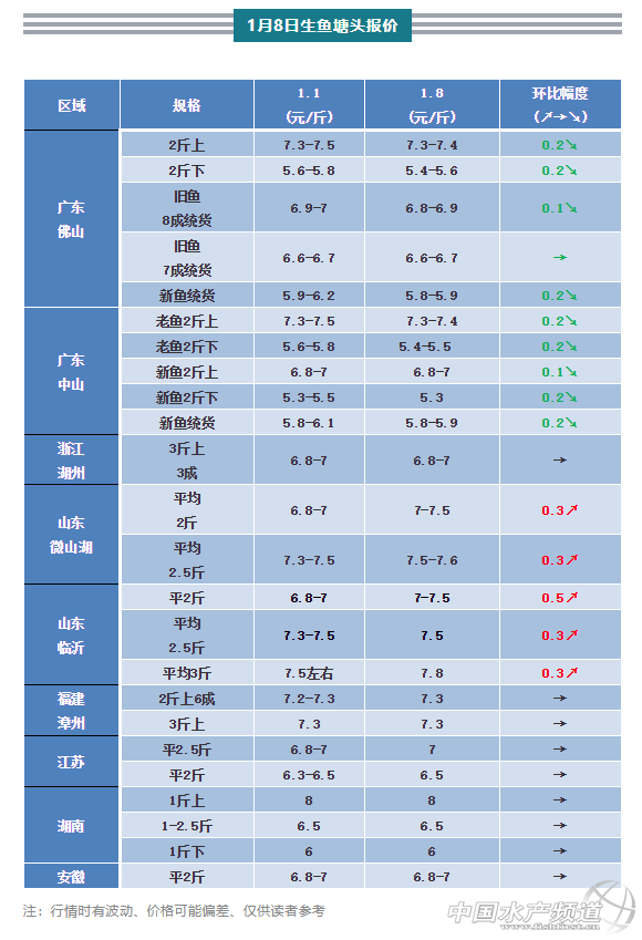 | 中國水產頻道原創報道, 生魚行情在波動迂回中上漲,逐步趨向穩定! 文/水產前沿 林貞武 最新報價、熱點行業資訊 生魚行情周報重磅來襲 每周相約水產前沿 據反饋這兩天生魚行情波動非常快,前幾天廣東魚價剛上漲了一點,這兩個天又回調了一點點,真讓人抓不住頭腦,不過對比以前來說算是爽市了些,定魚出魚情況沒有之前那么嚴峻。其他品種也是有漲有跌,黃顙魚繼續保持上漲的勢頭,廣東本周強勢升價超0.5元/斤,加州、生魚、羅非、鯽魚、泰蛙價格穩步上漲,鱖魚、草魚、白蝦、牛蛙、羅氏沼蝦、日本對蝦等又遭遇跌價,春節即將來臨,這些魚的行情是否能夠拉動一波,留待時間來證明。至于生魚這個魚來說,不管是新舊魚,按照目前的養殖成本以及市場發價來看,利潤不多,但是近期養殖戶賣魚比較理性,有人表示接下來的行情會是“波動迂回中穩步上漲的趨勢”,對短時間內的后市比較看好! 本周要聞 要聞1:本周廣東生魚行情下跌1-2毛錢,目前出魚欲望較之前高可點,據魚中表示目前叫看魚的養殖戶不少,魚市總體看來是爽了d。 要聞2:這兩天迎來大范圍的降溫天氣,目前江浙、湖北、山東、安徽等地陸陸續續在下雪,外省出魚會相對比較麻煩,同時隨著假期的到來,市場消費力會明顯增加,估計對魚價會有幫助。 要聞3:目前加工廠正在加班加點進行最后的生產,不過據相關從業人員表示,臨近年關,很多工廠基本上也快停工休息了,這個市場上對于魚的流通會有一定的影響。 2020年1月行情走勢 2018-2020年廣東佛山2斤上舊魚價格走勢 一周行情分析 生魚行情再次波動,挑逗養殖戶朋友的心弦,從以上曲線來看,2020年比2019年元旦后的價格起點要高一些,按照價格走勢來看,從現在到春節前后還是能夠有上漲的機會,特別是這兩天省外下雪,出魚積極性下降,同時寒假到來,工廠放假,消費量有所增加,業界人士表示,近期還是有上漲的機會,雖然目前存塘量相對比較大,但是也希望大家保持信心。 廣東佛山產區,本周微跌1-2毛錢/斤。本周塘頭價在一個星期內發生了兩次波動,剛開始時候稍微,前兩天又微跌,總體下調0.2元元/斤。鑒于前幾天的漲價,這幾天出魚積極性稍漲,據魚中反饋日前打電話約看魚的熱度高了點,但是相對比較理性。目前佛山新魚統貨價格為5.8-5.9元/斤,對比上周上跌0.2元/斤,7成魚則可以達到6.2元/斤左右,舊魚8成上統貨在6.8元/斤之間,環比微跌0.1元/斤,7成魚塘頭報價為6.6-6.7元/斤之間。有養殖戶反映現在外省收魚車真正來說其實不多,塘租又貴,生魚暫時進入“微利時期”。有養殖戶認為13-14號可能會有一波行情上漲的機會,讓我們拭目以待。 廣東中山本周跌價0.1-0.2/斤之間,2斤上新魚6.8元/斤,新魚2斤下5.3元/斤之間。舊魚2斤上7.3-7.4元/斤,2斤下5.4-5.5元/斤。目前出魚有些許利潤,但是養殖戶相對比較理性,有人預測隨著寒假學生放假、工廠放假,消費量會有所增加,加上北方降溫下雪等因素,接下來的生魚行情會在波動中上漲。甚至有人表示表示等明年初,最快則在一個星期左右,會有一波漲價。 山東,本周最高上漲0.5元/斤。受節日影響近日山東出魚數量不少,據了解基本上不出魚了,都留到年后價格再高點的時候再出手,出魚量的減少對山東當地的魚價產生了一定的拉動作用,另外加上這兩天山東降溫下雪,給出魚帶來了不便。目前平均2斤的魚塘頭價為7.3元/斤左右,條形好的給到7.5元/斤,平均2.5斤的魚發價為7.5-7.6元/斤之間,平3斤的塘頭發價最高可以達到7.8元/斤。目前會出魚的養殖戶估計就是前期虧得比較多,想趁漲價多賣一點,畢竟屬于少數。當地業界人士表示預計到年前繼續小范圍上漲,后市看好。 浙江湖州,本周行情暫無波動,出魚量變化不大,3斤上3成價格仍然保持在6.8-7元/斤之間。湖南本周行情無顯著變化,2.5斤上的塘頭發價為8.5元/斤左右,1-2.5斤的塘頭發價為6.4-6.5元/斤,1斤下的價格為6元/斤左右。江蘇本周行情穩定了些,該地區迎來又一波寒潮,本周出魚相對平穩了一些,目前平均2斤的塘頭價為6.5元/斤,平均2.5斤的塘頭發價為7元/斤。 安徽蚌埠,本周行情相對比較穩定。冷空氣已經來臨來臨,出魚相對較為平緩,目前平均2斤塘頭價為6.8-7元/斤,平均2.5斤發價為7.2元/斤,平均3斤塘頭報價為7.5元/斤。根據目前局勢有人預判魚價后期會升,對年后的價格有一定的期待。 福建漳州,本周行情平穩。出魚量不大,主要供應本地市場為主,在大環境無明顯波動下,該地區行情相對穩定。 本周總體來說出華南市場以外,其余產區已經逐步保持平穩狀態,個別穩中有升,各地區出魚量有所減少。外省出魚少利于廣東魚北上,對于廣東來說或許是一個即將迎來漲價的信號,怪不得有人敢預言13-14號或許會漲價。雖然加工產逐步放假停產影響收魚量,但是學校放假、工廠放假,消費量增加,加上寒潮的影響,對市場行情會有一定的拉動,權衡之下還是有機會漲價,讓我們拭目以待。 |