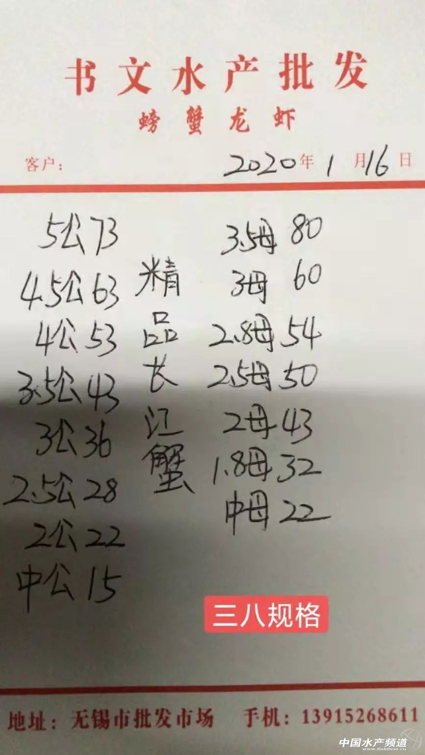 | 中國水產頻道原創(chuàng)報道, 扣蟹參考價 高淳 水陽 盤錦 成蟹行情解析 高淳 近期高淳精品蟹價持續(xù)上漲,今天蟹價整體大漲,平均蟹價漲5元/斤,各規(guī)格蟹價漲2-15元/斤不等。其中,4母漲15元/斤,漲幅最大;5公、3.5母均漲10元/斤,2母、3公均漲4元/斤。 興化 近期興化普蟹價格持續(xù)攀升,1月12日平均蟹價為26.6元/斤,今天平均蟹價45.1元/斤,上漲近70%。春節(jié)臨近,物流緊張,近期各地備貨增多,拉動蟹價持續(xù)上漲。 成蟹參考價 高淳 此報價由高淳倪老板提供 興化 此報價由興化丁老板提供 泗洪 此報價由泗洪孫老板提供 泗洪 此報價由無錫王老板提供 |