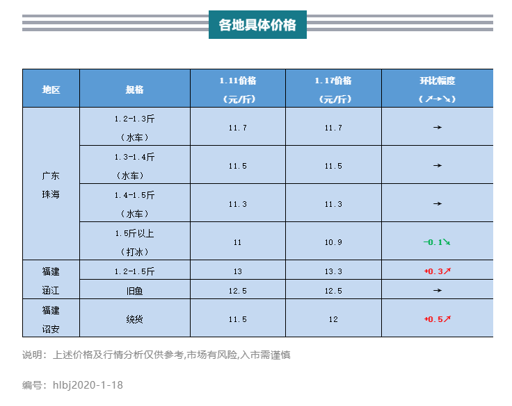 | 中國水產(chǎn)頻道原創(chuàng)報道, 春節(jié)臨近物流暫停,大部分冰車從今天開始已經(jīng)停止收魚。 文/水產(chǎn)前沿陳曉慶 養(yǎng)好魚,更要賣好魚 全新海鱸魚行情解析 水產(chǎn)前沿與您相約每周六 一周要聞 1、由于春節(jié)臨近物流暫停,大部分冰車從今天開始已經(jīng)停止收魚,而水車一般要收到除夕,大年初一停運(yùn)一天。冰車預(yù)計要到年初四才開始收魚,水車相對比較自由,不同魚中老板時間安排也有所不同。 2、珠海本地海鱸的放苗高峰期在12月份,目前養(yǎng)殖戶的放苗需求和速度有所減緩,年后有些養(yǎng)殖戶成活率不足的將會繼續(xù)補(bǔ)苗,預(yù)計又將迎來一個放苗小高峰。 3、業(yè)內(nèi)人士告訴筆者,現(xiàn)在大規(guī)格舊魚的存塘量有限,后市價格預(yù)計總體保持穩(wěn)定。現(xiàn)階段養(yǎng)殖戶見魚賣魚,且海鱸吃料系數(shù)好,有產(chǎn)量、有價格,今年舊魚走量預(yù)計會比上年更快。 4、往年春節(jié)前魚價都會有所上漲,但今年漲幅并不是很明顯,甚至有所下跌。業(yè)內(nèi)人士認(rèn)為,現(xiàn)階段海鱸價格高,且目前存塘充足,可上漲空間并不是很大,另一方面,流通端的競爭壓力大也導(dǎo)致了魚價的難以上漲。 圖片來自網(wǎng)絡(luò) 2019-2020年行情走勢 整體行情綜述 本周珠海海鱸水車價格平穩(wěn),與上周持平,冰車今日已經(jīng)停止收魚,昨日冰車報價10.9元/斤,與上周相比下降了0.1元/斤。 福建海鱸本周走量較好,價格全線上漲。涵江鱸魚1.2-1.5斤報價13.3元,與上周相比上漲了0.3元/斤,老鱸12.5元/斤。詔安鱸魚12元/斤,與上周相比上漲了0.5元/斤。 |