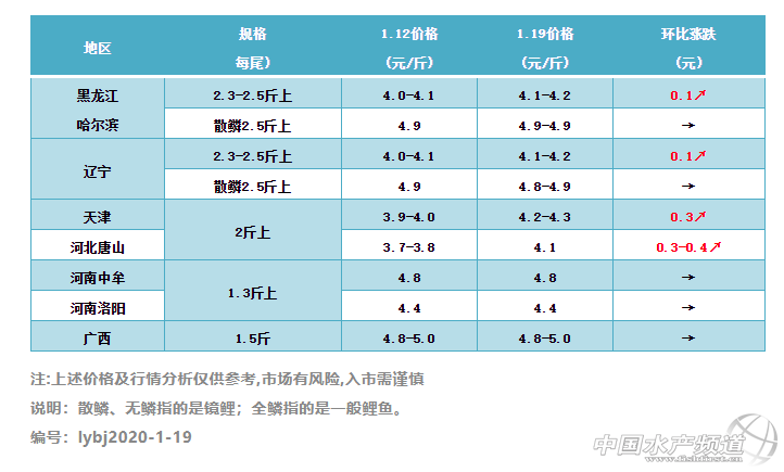 | 中國水產頻道原創報道, 供過于求,魚價漲也無太多空間 文/ 水產前沿 葉豐齊 代表產區鯉魚行情走勢 一周要聞 1.2019年下半年鯉魚行情非常不好,市場整體消費需求在下降,價格低養殖戶惜售,相較往年而言走魚量大大減少;目前存塘不少,但缺少水車拉魚,將要過年了,漲價沒有太大的空間; 2.東北如今少有人用鯉魚置辦年貨,春節后出魚量才會快一些; 3.唐山鯉魚存塘量50%,天津則約40%; 4.2020年河南30%鯉魚養殖戶轉養其他品種; 5.廣西桂林地區仍存有較大量鯉魚,供當地酸菜鯉魚消費。 整體行情綜述 本周部分主產區鯉魚價格上調;東北地區2.3-2.5斤以上規格全鱗鯉魚較上周回升0.1元/斤;河北唐山2斤以上規格鯉魚價格較上周上調0.3-0.4元/斤;天津2斤以上規格鯉魚較上周漲0.3元/斤;其他產區價格則與上周持平。 本周各地區鯉魚行情一覽 東北地區:遼寧和黑龍江哈爾濱2.3-2.5斤以上規格鯉魚4.1-4.2元/斤,環比上周小漲0.1元/斤;兩地2.5斤以上規格散鱗鏡鯉約4.9元/斤,同上周行情;與去年相比,今年仍存塘許多沒有賣出去的鯉魚,業者表示散鱗鏡鯉尤其較去年同期多,時下使用鯉魚置辦年貨的消費群體甚小,供過于求,拉魚水車少;整體價格不理想,養戶普遍惜售,有養戶表示出魚量要在春節后才可能加快一些。 河北唐山和天津地區:唐山2斤以上規格鯉魚4.1元/斤,環比上周上漲0.3-0.4元/斤;天津同規格鯉魚約4.2-4.3元/斤,環比上周上漲0.3元/斤;兩地鯉魚養殖規模相較以往已逐漸萎縮,但消費市場不好,行情低迷下,拉魚水車非常少,大部分鯉魚沒賣出去;據業者反映,唐山至少50%存魚量,而天津大約40%。 河南地區:當地鯉魚消費疲軟,魚價依然持平;1.3斤以上規格鯉魚,鄭州中牟4.8元/斤,洛陽4.4元/斤,兩地皆保持上周行情;據業內人士分析,這兩天鯉魚行情有抬頭的跡象,但受限于魚多水車少,實際價格還沒能漲起來;同時,業者還表示2020年河南鯉魚養殖量會進一步減少,至少30%鯉魚養殖戶轉養其他水產品種。 廣西地區:1.5斤以上規格鯉魚4.8-5元/斤,保持上周價格;桂林地區仍存有較大量鯉魚,供當地酸菜鯉魚消費,但整體走量不快。 |
