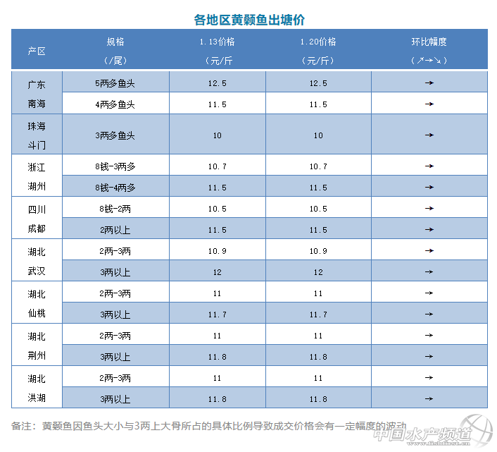 | 中國水產頻道獨家報道, 文/圖 何氏水產、水產前沿 李靜 黃顙魚 1、本周廣東黃顙魚價格與上周差不多,只是魚頭和收魚地方不同價格會偏差0.1-0.2元/斤,3兩魚多頭報價10元/斤,4兩多魚頭價格是11.5斤,5.0兩魚頭12.5元/斤。上周起市場需求量比平常多了30%左右,目前黃顙魚存塘量還挺大,小規格魚較多,大規格魚較少,市場需求還是以大規格魚為主,預計接下來價格暫時持穩。 2、本周浙江湖州黃顙魚價格保持穩定,上周起銷量大幅增漲,由于存塘量比較多,價格暫時漲不上去,預計年后銷量會緩慢下滑。 3、本周四川成都價格保持穩定,本地魚達上市規格的魚較少,流通商多到湖南等地拉魚,本地銷量還是比平常上升了一些。 4、本周湖北各地區黃顙魚價格與上周差不多,銷量比平日上升了30%左右,這兩天量最大,預計過兩天量會慢慢下降。 |