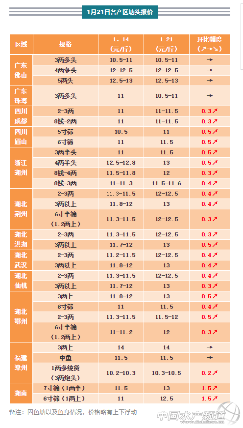 | 中國水產(chǎn)頻道原創(chuàng)報(bào)道, 全線飄紅!馬上新年了,黃顙魚價(jià)格持續(xù)大幅飆升 文/ 水產(chǎn)前沿 林貞武 最新報(bào)價(jià)、熱點(diǎn)行業(yè)資訊 黃顙魚行情周報(bào)正式發(fā)布 每周相約水產(chǎn)前沿 一周要聞 要聞1:黃顙魚爽市,繼續(xù)強(qiáng)勢(shì)上漲超1.5元/斤,其中廣東產(chǎn)區(qū)本周平穩(wěn),目前春節(jié)至初七初八的魚在前段時(shí)間已經(jīng)預(yù)定完成,據(jù)魚中表示,下一波定于大概會(huì)在初五左右進(jìn)行。其余產(chǎn)區(qū)如湖北、浙江、湖南、四川均有5毛錢左右的上漲,福建、江蘇周行情比較穩(wěn)定,本周漲幅最大為湖南,高達(dá)1.5元/斤。 要聞2:據(jù)了解,受肺炎影響,目前前往武漢拉魚的比較謹(jǐn)慎,很多魚車沒敢去武漢了,但是對(duì)于魚價(jià)暫未造成影響,有專家認(rèn)為其傳染途徑源可能是蝙蝠,與海鮮無關(guān)。 要聞3:今日降溫明顯!范圍大、強(qiáng)度強(qiáng)的雨雪天氣來襲,最高降溫幅度大,多地出現(xiàn)下雪地情況,底層魚溫度低不好打,人工費(fèi)增多好幾倍,對(duì)魚價(jià)會(huì)有明顯的拉動(dòng)作用。 要聞4:已經(jīng)臨近年關(guān),很多人暫時(shí)沒有交易的欲望,不管是魚中還是養(yǎng)殖戶,想趁這個(gè)時(shí)間好好陪陪家人,去到外地拉魚的更少了。 一周行情分析 2018-2020年湖北武漢3兩上黃顙魚成品魚價(jià)格走勢(shì) 臨近春節(jié),黃顙魚漲勢(shì)繼續(xù)保持喜人的姿態(tài),市場出魚理性,多地表現(xiàn)出對(duì)后市一片看好的態(tài)度。從本周開始,我國大部分地區(qū)繼續(xù)保持降溫天氣,部分區(qū)域飄雪,低于拉魚不方便,隨著大范圍的降溫到來,對(duì)行情有一定的促進(jìn)作用,當(dāng)前廣東產(chǎn)區(qū)魚中基本預(yù)定完成春節(jié)的魚,暫時(shí)無大做動(dòng)作,其他產(chǎn)區(qū)如湖北則看魚價(jià)隨時(shí)隨地定魚出魚,四川目前出魚積極性也不高。 對(duì)照2018年、2019年、2020年這三年年初的行情趨勢(shì),春節(jié)的魚價(jià)對(duì)比往年同期都要高。從大數(shù)據(jù)看,目前幾大產(chǎn)區(qū)繼續(xù)穩(wěn)中有漲,本周廣東保持穩(wěn)定狀態(tài)。隨著佳節(jié)到來,拉魚費(fèi)用增多,抓魚積極性下降,市場消費(fèi)量增大,春節(jié)前出現(xiàn)漲價(jià)小高潮。從年價(jià)格變化曲線來看,很明顯黃顙魚段時(shí)間內(nèi)將會(huì)持續(xù)保持歷史同期高價(jià)的狀態(tài),行情將繼續(xù)高調(diào)上漲!養(yǎng)殖戶也可以適當(dāng)選擇出魚。 廣東本周黃顙價(jià)格與上周持平。據(jù)了解,魚中前段時(shí)間已經(jīng)定過年左右出的魚,給價(jià)相對(duì)比較高,超3.5兩11塊左右,3.3魚頭的黃顙魚塘頭價(jià)為10.2左右,目前黃骨魚非常爽市,有魚中表示目前行情很好,魚頭偏大的很貴,魚頭小的升價(jià)則相對(duì)慢一點(diǎn)。當(dāng)前珠海以及佛山等地區(qū)3兩多普遍為頭10.5-10.8元/斤左右,4兩頭塘頭發(fā)價(jià)超12元/斤,4兩半頭以上有13元/斤左右,。年前的魚已經(jīng)訂好,據(jù)魚中表示,暫時(shí)基本沒有計(jì)劃定魚,初五左右再開始,預(yù)計(jì)仍有小范圍的上漲空間。 四川本周上漲0.5元/斤。養(yǎng)殖戶出魚也比較理性,目前該產(chǎn)地大戶魚基本出了,剩下小戶的比較多,很多人表示臨近春節(jié)想休息暫時(shí)不想出魚,也有部分人是等待著下一波漲價(jià),目前魚中表示當(dāng)?shù)夭缓枚~,魚車也不敢去武漢拉魚。成都2-3兩的塘頭發(fā)價(jià)為11-11.5元/斤,眉山4.5寸篩的價(jià)格最高也可以達(dá)到10.5元/斤,5寸篩發(fā)價(jià)11元/斤,環(huán)比上漲0.5元/斤,8錢-2兩規(guī)格的魚出得最多,預(yù)計(jì)后市看漲。 浙江湖州,本周價(jià)格上漲0.5元/斤。當(dāng)?shù)爻鲷~保持理性狀態(tài),市場流通較好,相對(duì)比上周出魚量多了一點(diǎn),最近這兩天強(qiáng)降溫對(duì)魚價(jià)有一定的幫助,同時(shí)加上春節(jié)即將來臨,消費(fèi)量增多,人工費(fèi)用增加,魚市表現(xiàn)良好。目前3.5兩頭的魚塘頭發(fā)價(jià)為11.5元/斤,環(huán)比上漲5毛/斤,4.5兩頭繼續(xù)往上達(dá)到精品魚規(guī)格的售價(jià)可達(dá)12.8-13元/斤,流通商表示接下來的魚價(jià)還能往上再拔一些,對(duì)后市保持樂觀態(tài)度。 湖北本周塘頭價(jià)暴漲1元/斤。隨著各地出魚趨于平穩(wěn),湖北當(dāng)?shù)爻鲷~也相對(duì)比較理性,好多養(yǎng)殖戶都不愿意賣,想著留著年后賣好價(jià)錢,加上最近幾天氣溫低很難打魚,工價(jià)翻倍,,拉魚公忙不過來,市場行情上漲明顯。本地存塘量逐漸減少,目前很多是外地貨,武漢產(chǎn)區(qū)目前3兩上的魚塘頭報(bào)價(jià)可以達(dá)到13元/斤,環(huán)比上周上漲超1元/斤,各地方2-3兩的魚價(jià)格本周高達(dá)12元/斤,3兩上的魚報(bào)價(jià)為13元/斤之間,甚至大一些的可以達(dá)到13.5元/斤。雖然近些天武漢肺炎事件沸沸揚(yáng)揚(yáng),對(duì)居民的出行有一定的影響,但是魚市依舊是健康發(fā)展,總體來說有個(gè)別地區(qū)會(huì)有大漲的機(jī)會(huì),多數(shù)地區(qū)則是穩(wěn)中有漲。 湖南本周價(jià)格最高上漲1.5元/斤。近期隨著養(yǎng)殖戶出魚越發(fā)理性,市面上流通相對(duì)比較順暢,銷量漲了。目前市場上黃顙魚存塘量大約有四成左右,主要集中在常德、岳陽,其