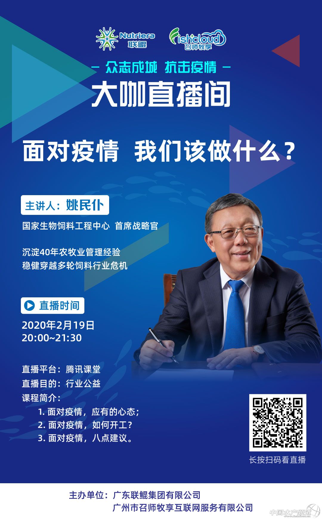 | 中國(guó)水產(chǎn)頻道報(bào)道, 面對(duì)疫情我們?cè)撟鍪裁? 主講人:國(guó)家生物飼料工程中心首席戰(zhàn)略官 姚民仆 沉淀40年農(nóng)牧業(yè)管理經(jīng)驗(yàn) 穩(wěn)健穿越多輪飼料行業(yè)危機(jī) 直播時(shí)間2020年2月19日20:00~21:30 直播平臺(tái):騰訊課堂 直播目的:行業(yè)公益 課程簡(jiǎn)介: 1.面對(duì)疫情,應(yīng)有的心態(tài); 2.面對(duì)疫情,如何開(kāi)工? 3.面對(duì)疫情,八點(diǎn)建議。 主辦單位:廣東聯(lián)鯤集團(tuán)有限公司 廣州市召師牧享互聯(lián)網(wǎng)服務(wù)有限公司 掃描下方二維碼即可觀看直播 |