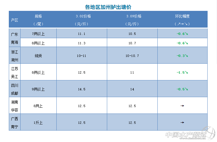 | 中國水產頻道原創報道, 文/圖 何氏水產、水產前沿 李靜 加州鱸 1、本周加州鱸再次下跌,主要原因是壓塘時間過長,魚規格偏大、大肚子情況嚴重。流通商對抓魚規格要求嚴格,塘頭壓價較多。本周廣東鱸魚8兩上開塘價10.7元/斤,比上周下跌了0.6元/斤;7兩以上價格在10.5元/斤,比上周也下跌了0.6元/斤;實際塘頭價格根據魚頭大小和規格不同略有浮動。除本地水車,外省水車也逐漸增加,銷量同比上周略有增長,預計接下來價格或將保持穩定。 2、浙江湖州今天統貨報價10-10.7,比上周下跌了0.3元/斤。具體價格要看魚頭大小和規格成數而定。本地銷量有所增加消費需求增大,后市魚價或有一定的上漲空間。 3、江蘇吳江的出塘量也相對上周有所上升,但總體量還是不大,價格與上周相比下跌了1.5元/斤,8兩上報價11元/斤,價格會根據魚頭大小及規格比例多少略有調整。當地養戶普遍養殖老口,養戶出魚積極性較低。預計價格上漲空間不大。 4、四川成都今天報價9兩上14元/斤,比上周下跌了0.5元/斤,本周銷量略有增加,價格或將保持穩定。 5、湖南華容本周價格保持穩定,8兩以上報價12.5元/斤,市場行情略有好轉,魚塘也開始出現大肚子情況。廣西南寧情況差不多,銷量也不大,報價12.5元/斤,保持穩定。受廣東魚價影響比較大,部分流通商選擇廣東收魚。 |