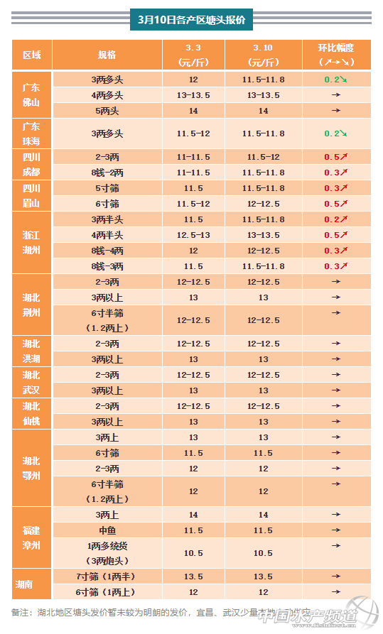 | 中國水產頻道原創報道, 大魚暢銷,價格高位運行,小魚難賣,小瓜蟲病已經悄然而至! 文/ 水產前沿 林貞武 最新報價、熱點行業資訊 黃顙魚行情周報正式發布 每周相約水產前沿 備注:湖北地區塘頭發價暫未較為明朗的發價,宜昌、武漢少量本地走動供應 一周要聞 要聞1:目前大部分餐飲業還沒開業,小規格黃顙魚市場消費力仍舊比較差,大規格魚較為暢銷,部分地區最高漲價0.5元/斤,小魚難走,價格微跌0.2元/斤。 要聞2:近期已經開始陸陸續續出現病害問題,特別是雜交黃顙魚已經開始有小瓜蟲病,其他也有少量爛皮腸炎等問題。 要聞3:目前天氣基本上回暖,特別是南方基本黃顙魚已經恢復吃料,吃一包賺“一包”,利潤高達150元以上,養殖戶出魚欲望不強。 要聞4:號外!目前仍是疫情攻堅的關鍵時刻,雖然各地病情基本逐步穩定,仍要做好防控工作,減少出行。 一周行情分析 2018-2020年湖北武漢3兩上黃顙魚成品魚價格走勢 本周黃顙魚繼續保持好轉的趨勢,價格繼續高位運行。流通量對比上周增加許多。目前湖北基本上還是沒辦法流通,除了保供應的幾輛車能走動幾千斤貨之外,大部分繼續“按兵不動”。其余產區已經陸陸續續出魚,市場對魚渴望增強,特別是大規格魚頭,魚價上漲勢頭猛烈,但是由于餐館未全面恢復營業,小規格魚稍有滯銷。氣溫逐步回暖,魚開始開口進食,除湖北產區飼料供應有所影響,其余產區投喂量有所恢復,基本上按照一包料長30斤的計算來看,成本160元左右,差不多投喂一包料可以掙100-150元左右。據了解,隨著疫情慢慢平穩下來,當前很多地區在交通管控方面明顯改善,各地陸陸續續也開始復工,批發市場陸續開市,近期各地養殖戶對黃顙魚今年的行情比較看好。 市場需求量繼續增加,湖南達3萬斤/天,廣東超8萬斤/天,成都3-4萬斤/天,福建出魚強烈。目前的魚價對比往年同期都要高,目前黃顙魚價格較年前已經呈上漲趨勢,總體趨勢良性發展,有可能再創歷史新高。市場解封,流通量增大,市場消費力增強,有人表示特種魚上漲趨勢即將大面積展開,但是在此需要提醒大家的是一旦市場全面解封,有人預測會有短時間內的跌價,但是會逐步恢復穩定,大家理性對待。另外小瓜蟲病以及爛身問題已經初現,廣大養殖戶注意做好防控工作。 廣東本周黃顙大魚頭價格堅挺,小規格魚降價0.2元/斤。廣東黃顙魚目前大規格不多,主要以3-4兩頭居多,大魚暢銷,而餐飲之類的還未全面打開,造成小魚難賣跌價。目前外省車相對比較多,市場上可見江蘇、江西、貴州、湖南、福建、浙江、廣西等地魚車,流通進一步暢通。目前魚中定魚積極性大大增強,但是養殖戶賣魚積極性不高。業界表示比較看好黃顙魚接下來的行情,應該會是穩中上漲的趨勢,目前大多數養殖戶賣魚欲望不強,經歷了越冬這個階段,大多數養殖戶還是想喂喂長點膘再賣。目前市場超3.5兩發價為11.5-11.8塊/斤左右,3.3魚頭的黃顙魚塘頭價為11-11.3元/斤左右,普遍掉價0.2元/斤,4兩魚頭的塘頭發價為12-12.5元/斤,4兩多頭的塘頭價為13-13.5元/斤,5兩頭的價格為14元/斤,行情相對穩定,未來可期。 珠海本周3兩多普遍為頭11.5元/斤左右,4兩頭塘頭發價12.5-13元/斤,4兩多頭為13-13.5元/斤左右,情況與佛山想類似。 四川本周價格上漲0.3-0.5元/斤。近期該地區魚基本開始吃料,養殖朋友基本上都想吃上個把月再出魚,同時自上周價格回落之后,魚販抓魚難度更加增大,另外目前出魚的養殖戶大部分是趕時間清塘出魚,計劃近期重新投苗,而一些大塘的養殖戶則是想繼續投喂貼點膘之后再出,不貿貿然出魚,現在水溫較低,怕刮傷之后感染水霉病,出魚心態相對比較平穩,欲望不強目前該產地出現小范圍的求大于供的狀態。成都市場目前的走貨量初步估計有3-4萬斤,當地近期的批發市場逐步開市,魚車走動逐漸頻繁,總體看來需求量日趨加大。成都2-3兩的塘頭發價為11.5-12元/斤,7-8錢的價格為12元/斤,眉山4.5寸篩的價格11-11.5元/斤,5寸篩發價11.5-11.8元/斤,6寸篩最高發價12.5元/斤,湖北地區解封時間不會太快,川內業界目前對后市看好。 浙江湖州,本周價格相對上周最高上漲0.5元/斤,走貨量稍微有所增加。這兩天當地出魚量對比之前增加明顯,水車也多了,魚販逐步定魚積極性加強。目前3.5兩頭的魚塘頭發價為11.5-12元/斤,4兩上的12-12.5元/斤,4.5兩頭為13元/斤,當地4兩以上量比較少,發價會比較高,有人預測一旦全面解封,短期內魚價可能會受到一定的沖擊,但是恢復平穩后還是會有機會,目前整體來說對后市還是比較樂觀。需要注意的是近期已經開始陸陸續續出現病害問題,特別是雜交黃顙魚已經開始有小瓜蟲病,其他也有少量爛皮腸炎等問題,養殖戶需要加強魚塘管理。 湖北本周塘頭暫未恢復正常交易,市場基本沒有發價。據了解目前出行管制嚴格,市場上暫時沒有動靜,政府部門初步估計得到3-4月份才正式解封,具體時間等通知。批發市場上現在也沒有流通批發,市面上看不到有魚賣,武漢白沙洲市場現有幾家試營業,政府安排用于供應武漢市內的居民,貨源從城邊抓的,外市無法走動。春季到來,水溫逐步升高逐步開口,飼料方面目前少數區域可以送養殖戶手中了,有些地方則只能到高速路口,需要注意的是寄生蟲等病害即將到來,部分池子長小瓜蟲了,魚藥很難買到,這對養殖戶來說是一大挑戰。武漢產區目前3兩上的魚塘頭報價為13元/斤,各地方2-3兩的魚