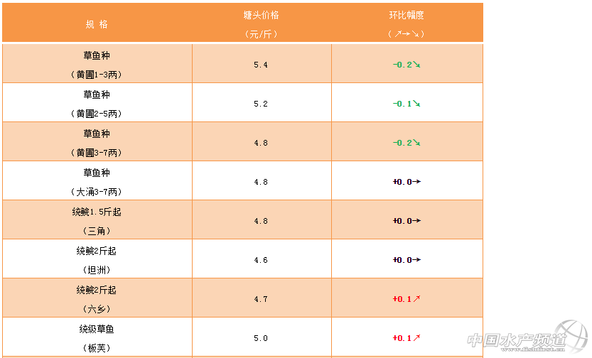 中國水產頻道原創報道,草魚種:草魚種價格相對上周跌價0.2元/斤,客戶趁著好價格集中出魚,養殖場連續出魚,受市場供需變化影響,價格下降。近段時間陰雨天氣較多,需做好爛身預防工作。