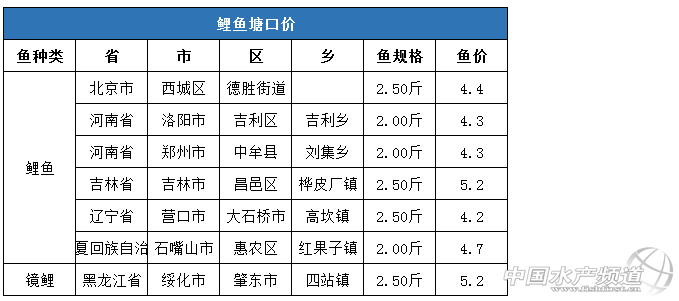 來源:通威農牧資訊 ,作者張梅 中國水產頻道報道,數據分析:本周全國鯉魚塘口均價4.7元/斤,同比下跌0.42%,環比上漲0.64%。 華北地區:吉林地區發病鯉魚基本出售完,健康魚較上周上漲0.1元/斤。黑龍江地區剛開塘,加之病魚較多,價格較上周下跌0.1元/斤。沈陽地區價格與上周持平。 華西地區:寧夏地區流通穩定,價格與上周持平。 |