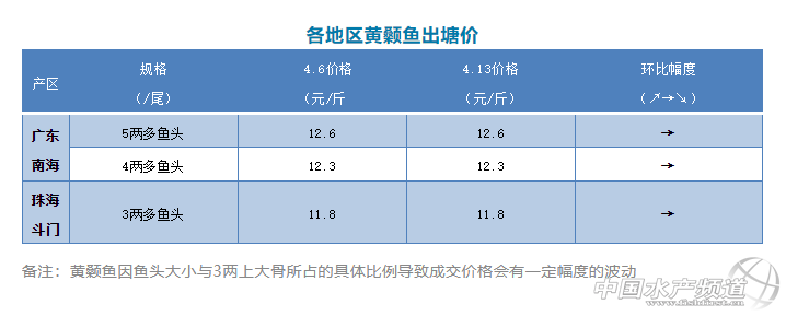 摘要: 中國水產頻道原創報道,本周廣東黃顙魚價格保持穩定,5.0兩魚頭的報價12.6元/斤;4兩多魚頭報價12.3元/斤;3兩多魚頭價格11.8元/斤。預計接下來價格變化不大,銷量跟上周差不多。