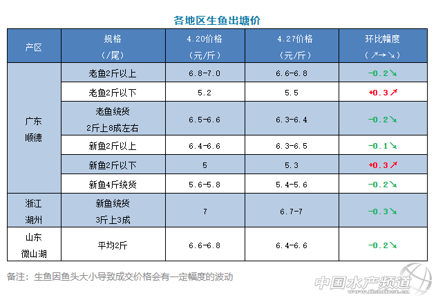 | 中國水產頻道原創報道, 文/圖 何氏水產、水產前沿 李靜 生魚 1、本周廣東生魚價格忽高忽低,塘頭報價老魚2斤以上報價是6.6-6.8元/斤,比上周下跌了0.2元/斤;2斤以下報價5.5元/斤,比上周上漲了0.3元/斤;老魚統貨、2斤上8成左右報價6.3-6.4元/斤,比上周上跌了0.2元/斤;新魚2斤上報價6.3-6.5元/斤,比上周下跌了0.1元/斤;2斤以下報價5.3元/斤,比上周上漲了0.3元/斤;4斤左右統貨報價5.4-5.6元/斤,比上周下跌了0.2元/斤。目前塘頭規格偏大,多是4-4.5斤魚頭,中小魚比例較少,但大生爛市,市場行情差,有下滑的趨勢。加工廠比較缺中小生魚,有少許上漲。現在生魚存塘量還有很多,銷量也在上升。預計接下來生魚價格或將持穩一段時間。 2、浙江湖州本周價格新魚統貨3斤上3成左右報價6.7-7元/斤,比上周下跌了0.3元/斤。山東微山湖產區本周價格6.4-6.6元/斤,比上周也下跌了0.2元/斤,銷量有所上升。 |