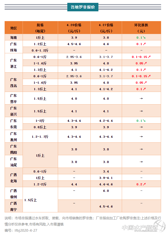 | 中國水產(chǎn)頻道原創(chuàng)報(bào)道, 本周羅非魚行情整體平穩(wěn),部分產(chǎn)區(qū)上調(diào)價(jià)格,少數(shù)地區(qū)微微下調(diào) 文/ 水產(chǎn)前沿 葉豐齊 水產(chǎn)前沿專業(yè)為你推送羅非魚 最新價(jià)格行情及行業(yè)新聞、各類資訊。 同時(shí)歡迎行業(yè)人士踴躍爆料,請(qǐng)掃二維碼聯(lián)系 代表產(chǎn)區(qū)羅非魚行情走勢(shì) 整體行情綜述 本周羅非魚行情整體平穩(wěn),部分產(chǎn)區(qū)上調(diào)價(jià)格,少數(shù)地區(qū)微微下調(diào);海南地區(qū)廠非收購價(jià)較上周下調(diào)0.1元/斤,市場(chǎng)非保持;珠三角地區(qū),珠海羅非上調(diào)0.1元/斤;新興、恩平羅非行情與上周持平;肇慶高要0.6斤上統(tǒng)貨3.1元/斤;東莞0.8斤上規(guī)格羅非價(jià)格不變,1.2-2斤規(guī)格下調(diào)0.1元/斤;粵東地區(qū)惠州市場(chǎng)非下調(diào)0.1元/斤;揭陽和汕尾地區(qū)廠非價(jià)格不變,市場(chǎng)非下調(diào)0.1-0.2元/斤;粵西地區(qū)湛江和茂名廠非0.6-1斤規(guī)格上調(diào)0.1-0.15元/斤,1-1.6斤規(guī)格上調(diào)0.05元/斤,1.3-1.5斤上市場(chǎng)非上調(diào)0.1元/斤;廣西地區(qū)北海0.6-1斤廠非3.4元/斤,1斤上廠非3.9-4.1元/斤,市場(chǎng)非上調(diào)0.2元/斤;南寧1.5斤規(guī)格市場(chǎng)非4.5-4.6元/斤,柳州同規(guī)格越冬魚6元/斤。 各產(chǎn)地行情分析 海南地區(qū):業(yè)者表示目前養(yǎng)戶正常出魚,越冬魚存塘量慢慢減少,加工企業(yè)本周收購180萬斤羅非,0.6-1斤規(guī)格2.8元/斤,1斤以上規(guī)格3.8元/斤,環(huán)比上周皆下調(diào)0.1元/斤;而1斤以上規(guī)格市場(chǎng)非塘頭現(xiàn)金收購價(jià)為3.5元/斤,和上周行情一致。 珠三角地區(qū):珠海羅非規(guī)格魚存塘量小,1.2斤以上市場(chǎng)非4.6元/斤,環(huán)比上周上調(diào)0.1元/斤;東莞羅非魚存塘仍較多,許多水車來抓,但整體而言流通不算很快,0.8斤以上規(guī)格外省水車抓3.9元/斤,同上周,1.2-2斤以上規(guī)格走本地市場(chǎng)4.2-4.4元/斤,環(huán)比上周下調(diào)0.1元/斤;恩平越冬魚規(guī)格漸大,小規(guī)格廠非和市場(chǎng)非不多,1斤上廠非3.8元/斤,1.5斤以上規(guī)格市場(chǎng)非4元/斤,皆保持上周價(jià)格;新興1.5斤以上規(guī)格市場(chǎng)非到手價(jià)4.1元/斤,同上周行情,目前還有部分越冬魚,出魚速度不快不慢;肇慶高要0.6斤上規(guī)格廠非統(tǒng)貨3.1元/斤。 粵東地區(qū):惠州有固定的魚車抓1.2-1.8斤規(guī)格羅非走惠州、東莞、深圳市場(chǎng),約4.3-4.4元/斤,同上周價(jià)格;外省水車抓同規(guī)格4元/斤,同上周行情;揭陽和汕尾方面,1斤以上規(guī)格廠非(走福建和汕尾本地凍廠)塘頭價(jià)3元/斤,同上周行情;工廠收購量小,市場(chǎng)流通方面也不太理想,1-1.2斤上規(guī)格4.1-4.2元/斤,環(huán)比上周下調(diào)0.1-0.2元/斤,大車塘頭批發(fā)價(jià)(每車2000-3000斤)更是低至3.7-3.8元/斤;據(jù)業(yè)者反映,汕尾從去年10月至今降雨量非常少,干旱期長(zhǎng)達(dá)6個(gè)月,一些池塘水位偏低,希望能盡快出完,歡迎省內(nèi)各市水車來拉魚。 粵西地區(qū):湛江、茂名兩地1.3-1.5斤以上規(guī)格市場(chǎng)非4.1-4.2元/斤,環(huán)比上周上調(diào)0.1元/斤;工廠方本周需求量上升,但存塘規(guī)格魚比較少,0.6-1斤規(guī)格個(gè)別工廠塘頭收購價(jià)3.1-3.3元/斤(依出魚數(shù)量定價(jià)),最高3.6-3.7元/斤(小規(guī)格成數(shù)多則價(jià)高,1斤以下超6成3.6-3.7元/斤),環(huán)比上周上調(diào)0.1-0.15元/斤;另有工廠以3.7元/斤收0.6斤上統(tǒng)貨,0.6斤上規(guī)格少于2成3.65元/斤,1.6斤或2斤上(根據(jù)不同工廠要求)超3成扣0.1元/斤,超4成扣0.2元/斤,以此類推;而1-1.6斤規(guī)格4元/斤,環(huán)比上周上調(diào)0.05元/斤。 廣西地區(qū):北海0.6-1斤規(guī)格廠非3.4元/斤,1斤上規(guī)格廠非3.9元/斤,出魚量超過1萬斤的4.1元/斤,而1.2-2斤規(guī)格市場(chǎng)非4.4-4.6元/斤(4.6是地網(wǎng)抓),環(huán)比上周上調(diào)0.2元/斤,超出2斤規(guī)格的則是4.5元/斤;南寧1.5斤上規(guī)格羅非4.5-4.6元/斤;柳州基本沒有多少存塘規(guī)格魚,大批量出的少散賣的多,1.5斤上越冬魚6元/斤,也有賣到6.5元/斤的。 |
