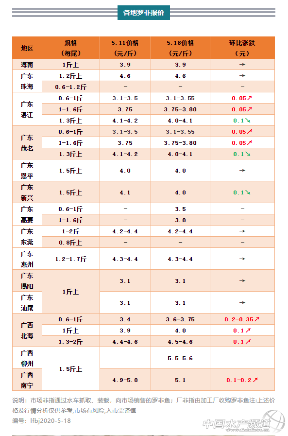 | 中國水產頻道原創報道, 廠非收購量下降,市場非排隊等出魚 文/水產前沿葉豐齊 水產前沿專業為你推送羅非魚 最新價格行情及行業新聞、各類資訊。 同時歡迎行業人士踴躍爆料,請掃二維碼聯系 代表產區羅非魚行情走勢 一周要聞 有加工企業人士告知筆者,當前羅非魚出口有點艱難:“從這個月起,公司很多出口訂單要押后交貨,等待海外客戶通知,也不知道要到什么時候。”他說道。另外,有業者表示公司現有訂單不受海外疫情影響,依然正常出口交貨,甚至還有客戶催單;不過,他也表示下半年訂單還沒確認,一切仍是未知數。 最近有業者反映部分加工廠停工放假,廠非收購量減少的事,說壓塘一段時間后,羅非只能排隊水車出市場,非常難走量。據筆者了解,確有這種情況,不過基本上是地區性影響。當地加工廠停收,而運輸到其他區域工廠代價太大,一般只能壓塘,隨著存塘魚規格慢慢偏大最后只能走市場,但當地市場流通量卻非常有限,省內其他地區水車也因路途較遠不來拉魚。 廣西方面已有一些加工廠停收廠非,還在收的廠主要收0.6-1斤規格小非,對1.6斤以上規格的需求減少,但本地魚存塘量還是比較少的,業者反映一天最多1萬-2萬斤流通量,基本沒有大塘魚;業者同時表示,為減少檢測費用,一般越大的車次價格越好,但最近到廠的羅非有太多市場挑出的規格,基本上是小車拉來的,一車大約2000斤-3000斤左右,不但難卸貨,檢測費用也相對較高。 關于藥殘檢測方面,有業內人士表達了一定程度的擔憂;目前加工廠所偏好的小非養殖密度本來就比較高,隨著氣溫上升,暴發病害死魚的風險大大增加,對漁藥的使用幾乎無可避免,出現藥殘的可能性也因而上升,或許會對入廠檢測達標率造成一定影響。 整體行情綜述 本周羅非魚行情整體平穩,部分地區稍稍漲價,少數下調;海南地區廠非收購價與上周一致;珠三角地區,珠海、恩平羅非保持上周價格,新興1.5斤上規格下調0.1元/斤,而肇慶高要0.6-1斤規格廠非3.5元/斤,1-1.6斤規格3.8元/斤,東莞1.2-2斤規格市場非價格不變;粵東地區惠州市場非價格保持,揭陽和汕尾地區廠非與市場非價格皆與上周持平;粵西地區湛江和茂名廠非0.6-1斤規格上調0.05元/斤,1-1.6斤規格上調0.05元/斤,1.3-1.5斤上規格市場非較上周下調0.1元/斤;廣西地區北海0.6-1斤廠非上調0.1-0.2元/斤,1斤上規格上調0.1元/斤,市場非上調0.1元/斤,南寧1.5斤規格市場非較上周上調0.2-0.35元/斤,而柳州1.5斤上市場非批發價5元/斤,出魚量較少的5.5-5.6元/斤。 各產地行情分析 海南地區:廠非收購量平均每天180萬-200萬斤左右,0.6-1斤規格2.9元/斤,1斤以上規格3.9元/斤,皆同上周行情;1斤以上規格市場非塘頭現金收購價3.5元/斤,與上周行情一致。 珠三角地區:珠海羅非商品魚存塘量小,價格保持穩定,1.2斤以上規格市場非4.6元/斤,同上周;據業者反映,目前除了小部分,養戶基本完成投苗,估計養殖量與去年持平;東莞1.2-2斤以上規格水車走珠三角市場4.2-4.3元/斤,同上周價格,基本是過冬魚,業者反映比較難走量,每天10多萬斤左右;恩平1斤上廠非3.8元/斤,1.5斤以上規格市場非4元/斤,皆同上周價格,不過有業者表示過冬魚已賣得七七八八,當地市場慢慢缺魚,應該能夠漲價;新興1.5斤以上規格市場非,有些要到1.7-1.8斤起抓,到手價4元/斤,環比上周下調0.1元/斤,業者表示當前市場依然很難走量,養戶出魚靠等,時間也較長;肇慶高要0.6-1斤規格廠非最高3.5元/斤,1-1.6斤規格3.8元/斤。 粵東地區:惠州1.2-1.8斤規格市場非4.3-4.4元/斤,同上周價格,本周氣溫稍稍下降,靚身魚多一些,出魚更順利也更走量,平均每天接近3萬斤;揭陽和汕尾1斤以上規格廠非(走汕尾本地凍廠)塘頭價3.1元/斤,同上周價格;1-1.2斤上規格市場非4.1元/斤,同上周,而大車塘頭批發價(每車2000-3000斤)3.5-3.6元/斤左右,環比上周下調0.1元/斤;去年老魚已經所剩無幾,過冬魚存塘量不多,但養戶投料也不是很積極,而且當地比較缺水,放新苗的少。 粵西地區:湛江、茂名兩地1.3-1.5斤以上規格市場非4-4.1元/斤,環比上周下調0.1元/斤;工廠方面,0.6-1斤規格收購底價最高3.1元/斤,1斤以下成數每多1成增加0.1元/斤,最高可去到3.55元/斤(1斤以下超6成3.55元/斤),環比上周上調0.05元/斤;1-1.6斤規格3.8元/斤,環比上周上調0.05元/斤;而1.6斤以上規格收購量減少,但看廠方規定,有些停收,而且限制得比較嚴格。 廣西地區:北海0.6-1斤規格廠非3.1元/斤,若6成不過斤則3.6元/斤左右,最高可去到3.75元/斤(按每車重量及當車比例)環比上周上調0.2-0.35元/斤;1斤上規格廠非約4.0元/斤,環比上周上調0.1元/斤,若出魚量超過1萬斤則4.1元/斤(看量,有魚則可以談);因為工廠收購價相對低,走市場的量會更高一些,而且目前多數魚規格偏大;1.3-2.5斤規格市場非4.5-4.6元/斤(地網抓),每天2萬-3萬斤走南寧和柳州,不過受廣東魚沖擊,價格一直上不去;南寧1.5斤上規格羅非5.1元/斤,環比上周上調0.1元/斤;柳州1.3-1.5斤以上規格羅非魚市場批發價5元/斤,有業者表示剛剛出了2萬斤左右;另有業者反映出魚量較少的能達到5.5-5.6元/斤,也有人出幾百斤魚大約6-6.5元/斤。 |
