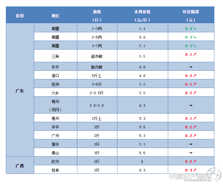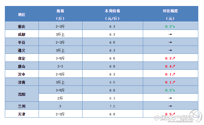 | 中國水產頻道原創報道, 福建草魚繼續穩定在7元/斤以上,本周江蘇、河北部分地區塘頭價也已突破了7元/斤 文/水產前沿鄭鵬飛 一周要聞 隨著疫后全國各地餐飲業的復蘇,近期很多水產品出現供不應求的情況。加上各大海域禁漁的開始,目前淡水魚的整體情繼續保持上漲勢頭。 江蘇地區3斤的草魚賣到7元/斤 四川地區鯽魚行情再次上漲 目前各地的草魚存塘已經不多,一些地區已經無魚可賣。據了解,目前3斤的草魚在福建地區塘頭價繼續穩定在7.3元/斤左右,本周江蘇、河北部分地區塘頭價也已突破了7元/斤。 廣東中山3斤的草魚再漲0.1元/斤 目前,3斤左右的草魚在廣東中山地區塘頭已賣到5.6元/斤,上漲0.1元/斤;廣西桂林地區最新報價6.3元/斤,上漲0.3元/斤;湖南永州地區塘頭賣6.5元/斤,最高上漲0.7元/斤;河南開封地區最新塘頭價賣5.7元/斤,上漲0.2元/斤;四川德陽、廣元、綿陽等地區最新塘頭價賣到6.4元/斤左右,繼續有0.2元/斤的左右的上漲;湖南常德地區最新塘頭價賣5.5元/斤。 湖南永州草魚再漲0.7元/斤 但是,由于天氣不穩定導致近期魚塘壓力突然增大,一些地區的草魚行情開始出現下滑的跡象。據了解,最近幾天廣東中山地區草魚苗種行情出現明顯下滑,1-3兩的草魚苗最新塘頭價賣6.4元/斤,下滑0.4元/斤。江西南昌地區3斤的草魚塘頭價賣5.5元/斤,最高下滑0.8元/斤;湖北洪湖地區最新報價5.6元/斤,下滑0.4元/斤;江蘇徐州地報價6.3元/斤,下滑0.5元/斤;浙江衢州賣5.5元/斤,最高下滑0.8元/斤。 接下來的草魚行情還會漲嗎?歡迎留言分享! 行情分析 華南地區 由于存塘草魚不多,近期華南地區的草魚成魚整體行情繼續有小幅回升。但是,由于突然的高溫導致苗種運輸難度加大,存塘壓力加大,最近幾天草魚苗種的行情出現明顯下滑。 中山:從流通商了解到,目前中山地區3斤的草魚最新塘頭價賣5.6元/斤,較上周繼續有0.1元/斤的小幅上漲。據業內人士介紹,由于氣溫的突然升高,最幾天中山黃圃的草魚苗種行情出現明顯回落。目前,1-3兩的草魚最新塘頭價賣6.4元/斤,較之前最高下滑0.4元/斤。 肇慶:本周肇慶地區的草魚行情還繼續保持相對穩定。從養殖戶了解到,目前3斤的草魚最新塘頭價賣5.3元/斤,沒有出現明顯波動。 梅州:本周梅州地區的草魚行情也是以穩定為主。據業內人士介紹,目前梅州地區3斤左右的草魚最新塘頭價基本維持在6.2-6.3元/斤。 廣西:本周廣西地區的草魚行情整體還是保持相對平穩,局部地區有小幅漲跌。據養殖戶介紹,目前桂林地區3斤的草魚塘頭價基本還是維持在6.3元/斤,部分地區有小幅上漲;武宣地區的最新塘頭價賣6.2元/斤,相比之前有小幅回落。 華中地區 由于天氣的不穩定,近期華中地區局部草魚行情出現下滑跡象。但是,由于存塘魚不多,很多地區基本無魚可賣,目前整體行情基本保持穩定,部分地區塘頭繼續呈現上漲勢頭。 江西:本周南昌地區的草魚行情整體上繼續繼續保持穩定,不過最近幾天部分地區行情出現明顯的下滑勢頭。有養殖戶反映,目前江西南昌地區3斤的草魚塘頭價在5.5元/斤左右,較上周最高下滑0.8元/斤。養殖戶表示,近期草魚行情不是很穩定,并對后期行情表示擔心。 湖北:本周湖北地區的草魚行情也是穩中有降。據最新了解,這幾天湖北洪湖地區的草魚行情出現下滑,3斤左右的草魚塘頭賣5.6元/斤左右,較之前最高下滑0.4元/斤;仙桃地區3斤的草魚最新塘頭價賣5.1元/斤,相比之前有0.2元/斤的小幅下滑;隨州地區的草魚行情繼續保持穩定,3斤的從草魚最新塘頭價賣6元/斤,基本維持上周水平。 湖南:由于目前存塘魚不多,本周湖南地區的草魚仍有多個地區繼續保持明顯的上漲勢頭,有部分地區塘頭價也是出現小幅回落。據了解,目前湖南邵陽地區3斤的草魚塘頭賣5.5元/斤,相比上周繼續有0.3元/斤的上漲;南永州地區3斤以上的草魚最新塘頭價賣6.5元/斤,較之前最高上漲0.7元/斤。有養殖戶反映,目前常德地區3斤的草魚最新塘頭價賣5.5元/斤,不過這兩天行情回落的跡象。 河南:本周河南地區的草魚塘頭價再次出現小幅上漲。據養殖戶介紹,目前開封地區3斤的草魚最新塘頭價賣5.7元/斤,較之前繼續有0.2元/斤左右的上漲。 華東地區 如同近期的天氣一樣,本周華東地區的草魚行情不是很穩定,局部市場出現較大幅度的漲跌情況。 福建:本周福建地區的草魚行情還是繼續保持穩定,暫時沒有出現大的波動。從養殖戶了解到,目前閩江地區3斤的草魚最新塘頭價賣7.3-7.4元/斤,預計這個價格還會維持1個月左右。目前,三明地區3斤的草魚塘頭賣7.3元/斤左右,基本維持上周水平。 江蘇:本周江蘇地區的草魚行情有漲有跌。據養殖戶介紹,目前淮安部分地區3斤的草魚最新塘頭價也已經賣到7元/斤;泰州地區3斤的草魚塘頭最新報價6元/斤,較上周再次上漲0.2元/斤。不過也有部分地區出現了明顯的下滑。據了解,目前淮安部分地區2-4斤的草魚最新塘頭價出現0.2元/斤左右的下滑;目前徐州地區3斤的草魚最新塘頭價賣6.3元/斤,相比上周有0.5元/斤左右的回落。 浙江:本周浙江地區的草魚塘頭價也出現了下滑。從養殖戶了解到,這幾天浙江地區的草魚行情出現回落,目前衢州地區3斤的草魚最新塘頭價賣5.5元/斤,較上周最高下滑0.8元/斤。 其他地區 東北地區:本周東北地區的草魚行情基本保持穩定,局部地區有小幅波動。從養殖戶了解到,目前遼寧沈陽地區2.8斤的草魚最新塘