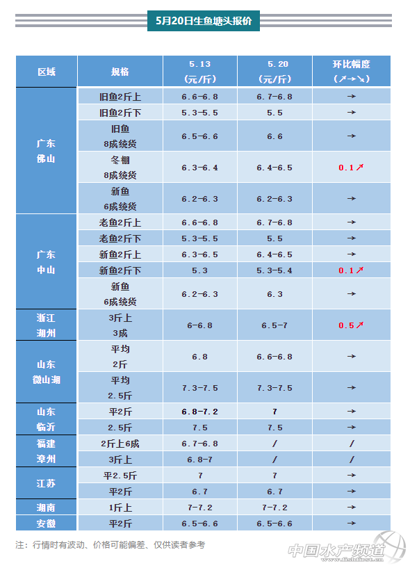 | 中國水產頻道原創報道, 市場病魚逐漸處理結束,水溫升高出魚難度增加,魚價平穩或將有上漲! 文/水產前沿林貞武 最新報價、熱點行業資訊 生魚行情周報重磅來襲 每周相約水產前沿 本周要聞 要聞1:目前各大產區基本上逐步進入投苗的關鍵時期,山東規格為三條1斤,本周苗價售6-6-6.8元/斤,湖浙江湖州售價6元/斤左右,廣東黑芝麻售價超400元/萬,其中中山更是達到了500元/斤,500-1000口斤土塘朝魚左右售價為4.2-4.5毛/尾。 要聞2:江浙病魚接近結束,上漲0.5元/斤,另外隨著水溫的升高,在出魚方面越加不便,廣東已經開始出現刮魚硬骨無法上車的現象,據魚中反饋前兩天開兩塘魚,就有一塘上不了車,養殖戶朋友在出魚方面得做好防范措施,減少應激損失。 要聞3:目前各產區存塘逐漸減少,山東臨沂存塘魚很少了,福建漳州養殖市場已經沒有存塘魚,加上氣溫升高出魚難度增大,有流通表示可能一個星期左右魚價就會有所突破。 要聞4:據天氣預報顯示,順德今明兩天將有暴雨降水過程,即將進入“龍舟水”降水集中期,養殖戶朋友需要注意魚塘用電以及人身安全 2018-2020年行情走勢 2018-2020年廣東佛山2斤上舊魚價格走勢 一周行情分析 本周多數養殖品種持續上漲,廣東加州鱸魚最高漲3元/斤,草魚元不夠賣,桂魚最高漲6元/斤,黃顙魚最高漲了5元/斤,塘頭價最高21元/斤,羅非魚漲了0.35元/斤,總的來看可以說是穩中有漲。按照目前的養殖成本以及市場發價來看,以廣東為例,生魚新魚成本普遍為6/斤以上,舊魚成本較高,部分區域達到8元/斤。近期很多特種水產魚價都在漲價,從全盤看,大部分人認為餐飲酒店恢復,市場流通量上來,加上多地進入禁漁期,減少了捕撈水產品的沖擊,加上高溫期逐步到來出魚風險增大,開塘減少等有一定的關聯,養殖水產品漲價的機會應該還是有的。不管是新魚舊魚廣東養殖戶仍處于虧本狀態,山東、浙江、江蘇等地由于投喂不同,成本低些,多數堅持到現在的養殖戶出魚欲望不強,在等待行情中。 廣東佛山產區,本周相對平穩。目前生市場生魚暫時保持平穩走貨,市魚價存在變數,加上近期天氣悶熱,出魚風險增大,拉網容易硬骨出問題,魚中反饋近兩天有些魚裝不上車,流通商開魚方面有一定的考慮。佛山新魚6成統貨價格為6.2-6.3元/斤之間,舊魚8成上統貨在6.6元/斤左右,棚魚2斤上8成塘頭開價6.5元/斤。目前廣東生魚養殖戶出魚基本都處于虧本狀,養殖戶出魚積極性不高。廣東黑芝麻受天氣影響,苗場出苗量少,放苗的人逐步增多,大部分養殖戶出魚后仍然放生魚,想再博一下,朝魚和黑芝麻比較貴,1000口斤價格在5毛/尾左右,黑芝麻漲價到400元/斤。有流通商表示再過一個星期左右,魚價或將有突破。 廣東中山本周價格穩定。情況與佛山類似,2斤上新魚6.3-6.5元/斤,新魚2斤下5.3-5.4元/斤左右。舊魚2斤上6.6-6.8/斤左右,2斤下5.3-5.5元/斤。目前新魚成本為6元多,新魚2斤上5-6成塘頭開價6.1-6.3元/斤左右,棚魚2斤上8成開價6.4-6.5元/斤,舊魚開價6.6元/斤左右,主要看成數和身材。養殖戶目前賣魚虧本,有些人選擇虧本出魚,重新放黑芝麻,業界建議養殖戶如果市場有價可以適時出魚。目前中山水花價格有些賣到了500元/萬,土塘朝魚800-1000口斤的價格在0.42-0.45元/尾不等,當前中山、九江會珠三角其他地方貴點。 山東本周價格波動不大。部分如臨沂產區存塘量很少,微山相對多些,目前平均2斤的魚塘頭價為6.8元/斤左右,身材好的能達到7元/斤,平均2.5斤的魚發價為7.3-7.5元/斤左右。雖然今年苗雖少,但養的人也少了,也有部分養殖戶想再博一次,總體看來放苗量同比有所減少。 浙江湖州本周價格上漲0.5元/斤。當地目前病魚基本處理完畢,魚價有所回暖,3斤上3成價格開價為6.5-7元/斤之間。有養殖戶表示隨著高溫的到來,有些人怕損失可能會造成集體出魚等現象,會出現魚價下跌的可能。當地目前放苗的不是很多,計劃養的基本都放好苗了,很多是老養殖戶在堅持養,新養的很少,甚至有些養殖戶今年不計劃養這個魚了。 江蘇市場價格差別不大。本周病魚基本處理結束,好魚價格穩中微調,當地塘頭價格為平均2斤的塘頭價為6.7元/斤左右,平均2.5斤的塘頭發價為7元/斤,但是業界表示后市還是有空間,養殖戶需理性出魚。 安徽蚌埠本周行情相對穩定。本周銷量跟平時差別不大,平均2斤塘頭價為6.5元/斤,平均2.5斤發價為7元/斤。 福建漳州,本周行情暫時無報價。當地市場目前生魚基本出完,沒有存塘魚,另外今年放苗同比往年有所減少。湖南本周銷量變化不大,統貨7元/斤之間,市場2斤上批發價為7.7-7.8元/斤之間,魚相對廣東而言好走點。 |