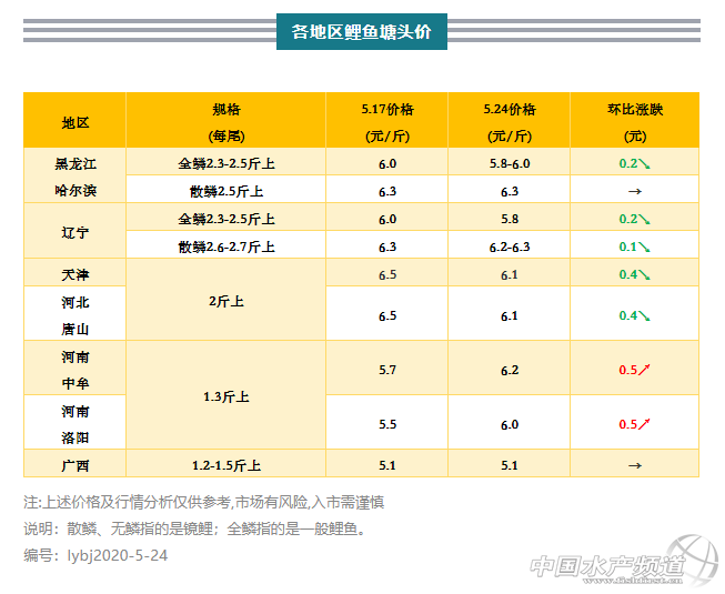 | 中國水產頻道原創報道, 規格商品魚無幾,水車不愿來拉魚 文/水產前沿葉豐齊 代表產區鯉魚行情走勢 整體行情綜述 本周部分產區鯉魚價格下調,一些地區價格持平,河南魚價上調。黑龍江和遼寧2.5斤以上規格全鱗鯉魚價格較上周皆下調0.2元/斤,黑龍江2.5斤上散鱗價格不變,遼寧2.6-2.7斤上散鱗價格下調0.1元/斤;天津和唐山地區2斤上鯉魚較上周皆下調0.4元/斤;河南中牟和洛陽鯉魚行情較上周皆上調0.5元/斤;廣西1.2-1.5斤上統貨價格和上周一致,2-3斤規格售罄無價。 本周各地區鯉魚行情一覽 東北地區:黑龍江基本沒有商品魚了,遼寧還剩下一部分,據業者反映出魚不算積極,應是當地市場受到管控影響,一些養戶還在觀望,而外地水車因為出魚量少不太愿意過來;黑龍江2.5斤以上規格全鱗鯉魚5.8-6元/斤,環比上周下調0.2元/斤;2.5斤以上規格散鱗鏡鯉6.3元/斤,同上周價格;遼寧2.5斤上全鱗鯉魚5.8元/斤,環比上周下調0.2元/斤;2.6-2.7斤上散鱗鏡鯉6.2-6.3元/斤,環比上周下調0.1元/斤。 河北唐山和天津地區:唐山和天津2斤上規格鯉魚6.1元/斤,環比上周下調0.4元/斤;業者表示目前外來水車減少,應和出魚量以及氣溫有一定關系,加上之前拉回去的魚在當地市場可能還有一點量沒走完,他認為魚價要開始下調了,建議還沒清塘出魚的養戶趕緊行動。 河南地區:當地基本沒有符合上市規格的商品魚,目前市場正處于青黃不接狀態,鯉魚價格一直在上漲;1.5斤以上規格,鄭州中牟6.2元/斤,洛陽6元/斤,環比上周皆上調0.5元/斤。 廣西地區:當地2-3斤大規格舊魚已經賣完,由1.2斤上抓起的新魚統貨(塘頭價5.1元/斤)也很少,目前存塘大多是0.5-1斤規格的,到處都缺規格魚,行情暫時沒有變化。 |
