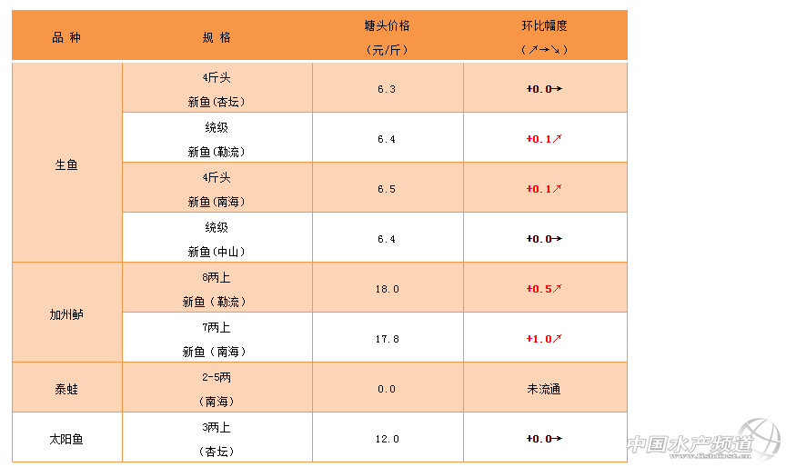 文/ 珠海海龍、水產前沿 何鴻浩 生魚 中國水產頻道原創報道,順德杏壇:本周價格走勢平穩。舊魚7-8成左右統級6.5-6.7元,新魚大魚5-7成統級發價6.1-6.4元。此外,高溫天氣來臨,生魚投喂逐步加料,建議做好腸胃護理工作。 勒流區域:魚價略微上漲,但近期泄春比較厲害,去年早批魚泄春損耗價值大于魚價上漲價值。近期下雨利于減少運輸損耗,有助于市場走量。同時,魚塘管理要做好改底及消毒措施,加強內服保健避免產后病。 南海西樵九江:近期魚價整體小幅度增漲,統級抓5~8成大魚開價6.1~6.7元,終端存塘量相對去年同期少,市場流通量大,預計高峰期會有較大漲幅。 中山區域:近期生魚價格基本保持穩定,舊魚8成大魚統貨6.5-6.7元,新魚7成左右統級6.3-6.5元。另外,近來雨水天氣較多,容易引起魚塘應激,建議做好改底和防應激處理。 |