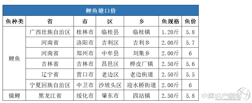 來(lái)源:通威農(nóng)牧資訊 作者:張梅 中國(guó)水產(chǎn)頻道報(bào)道,數(shù)據(jù)分析:本周全國(guó)鯉魚塘口均價(jià)5.8元/斤,同比上漲8.21%,環(huán)比下跌0.51%。 華北地區(qū):河南地區(qū)熱水魚陸續(xù)出塘,每天銷售鯉魚約8-10萬(wàn)斤,價(jià)格下跌0.2元/斤。沈陽(yáng)地區(qū)受疫情影響,流通量減少,價(jià)格下跌0.1-0.2元/斤。吉林地區(qū)存塘魚較少,基本為本地消化,受疫情影響較小,價(jià)格較上周上漲0.1元/斤。黑龍江地區(qū)鯉魚價(jià)格與上周基本持平。 華西地區(qū):銀川地區(qū)價(jià)格與上周基本持平。 |
