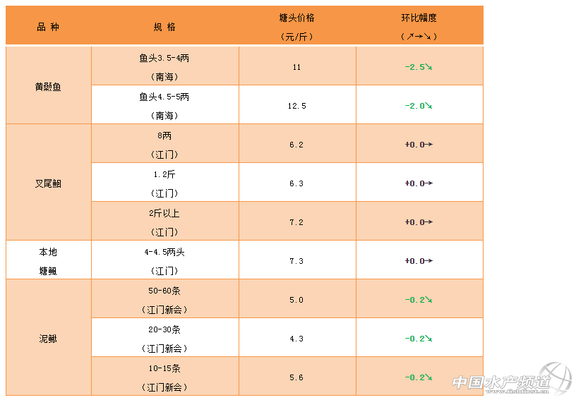 文/ 珠海海龍、水產(chǎn)前沿 何鴻浩 中國水產(chǎn)頻道原創(chuàng)報道,南海區(qū)域黃顙魚:本周價格有所下降,其主要為上周疫情影響、市場封閉,消費量有所影響導(dǎo)致。目前市場存塘多為4、5兩塘的舊魚,甚至毛毛魚都已經(jīng)很少。對于后續(xù)新魚開市3、4兩的魚頭,業(yè)界還是較看好。 |