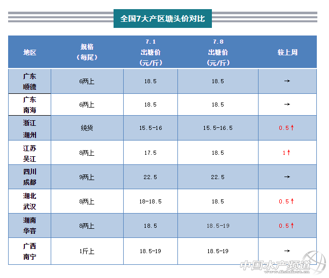 | 中國水產頻道原創報道, 文/水產前沿實習編輯殷騰蛟 圖/杰大飼料 一周行情綜述 最近一周,湖北、湖南、江蘇、江西、安徽等地均遭遇持續暴雨襲擊,尤其是湖北黃岡一片汪洋,大量魚塘漫頂,部分養殖戶的加州鱸塘已被淹沒。不僅如此,目前長江水位仍在上漲,很多鱸魚塘依然岌岌可危。 據廣東某主流流通商反映,隨著北京疫情形勢緩解,北方水產市場或將逐步解封,加州鱸消費有復蘇跡象。而隨著各地整體存塘量下降,本周加州鱸價格穩中有升,湖州、吳江、華容、武漢分別上漲了0.5-1元/斤,預計隨著市場進一步復蘇,加州鱸價格將繼續看漲。 主產區行情簡析、報價 廣東佛山:今天佛山舊魚6兩上報價18.5元/斤,和上周相比沒有太大波動。本地老魚偏大,相比之下,規格較小的秋苗更容易在市場上走俏。有流通商表示:“最近養殖戶出魚積極性較高,市場供大于求,但北京市場沒開,所以走貨量不是很多。”同時也有不少人持觀望態度,等待高價。 近期佛山地區氣溫較高,抓魚較易出現“硬骨”,同時也是加州鱸病害集中爆發的時期,爛身較多,養殖戶需要警惕,加強管理或選擇及時出魚。總體上,本周情況與上周相比變化不大,魚價平穩。 浙江湖州:湖州今天統貨報價15.5-16.5元/斤,較上周上漲約0.5元/斤。湖州存塘量已不多,養戶出魚少,部分流通商選擇到吳江拉魚以滿足市場需求。 江蘇吳江:吳江加州鱸行情節節攀升,今天統貨價格達到16.5元/斤,8兩上18.5元/斤,9兩上19元/斤,較上周漲幅明顯。隨著江浙滬和北方市場復蘇,到吳江拉魚的流通商增多,刺激了魚價上升。 四川成都:成都9兩上報價22.5元/斤,與上周持平。本地存塘魚不多,市場需求較旺盛,當地一飼料經銷商告訴筆者:“今天裝了一萬七千斤魚,勉強能夠供應市場。”除在本地拉魚外,也有不少流通商會選擇到廣東、湖南等地拉魚以彌補本地存塘不足的問題。 湖北武漢:武漢報價18.5元/斤,比上周同期上漲約0.5元/斤。湖北本地市場成魚存貨量已經不多,但近日湖北持續暴雨,池塘水位上升,漫塘風險加大,養殖戶出魚困難,市場走貨量有所縮水。 湖南華容:華容今日8兩上報價18.5-19元/斤,比上周同期漲了0.5元/斤左右。市場需求較大,但目前存塘量已不多,預計后期價格還有上漲空間。 廣西南寧:南寧1斤上報價18.5-19元/斤,與上周持平。本地存塘鱸魚不多,市場比較缺魚,同時因為近期高溫暴雨天氣較頻繁,養殖戶多選擇出統貨。 |
