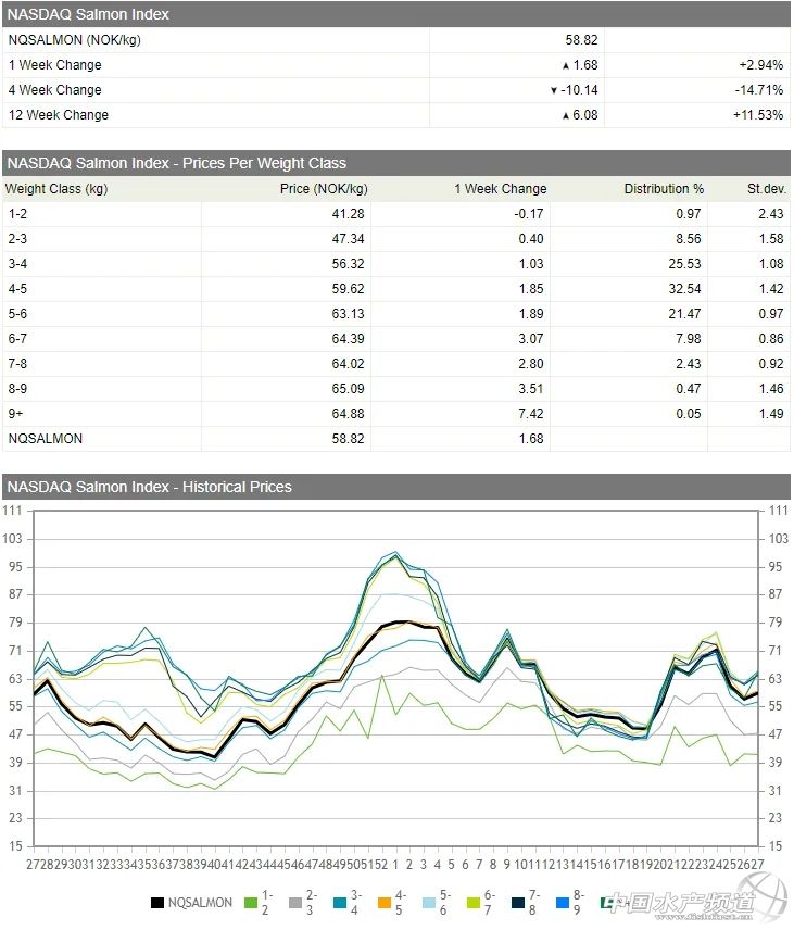| 中國水產頻道報道, 6kg以上規格三文魚價格上漲較大,上漲約NOK 3/kg。 作者/UCN 編譯/胡路怡 2020年第27周,挪威養殖大西洋鮭市場價格開始回彈。納斯達克三文魚指數顯示,挪威三文魚均價為NOK 58.82/kg,較上一周上漲NOK 1.68/kg,漲幅2.94%,但相比一個月前的價格,仍有14.71%的跌幅。 其中,6kg以上規格三文魚價格上漲明顯,6-7公斤漲幅為NOK 3.07/kg,4-5公斤漲幅為NOK 1.85/kg。 另據Fish Pool的統計,第27周挪威三文魚價格為NOK 59.69/kg,較一周前上漲NOK 1.62/kg,漲幅2.78%,但較一個月前下跌15.63%。第27周,挪威出口16,147噸三文魚,出口量較去年同期增長2.2%。(本文轉自【UCN國際海產資訊】。如有版權問題,敬請聯系wx@fishfirst.cn。) |