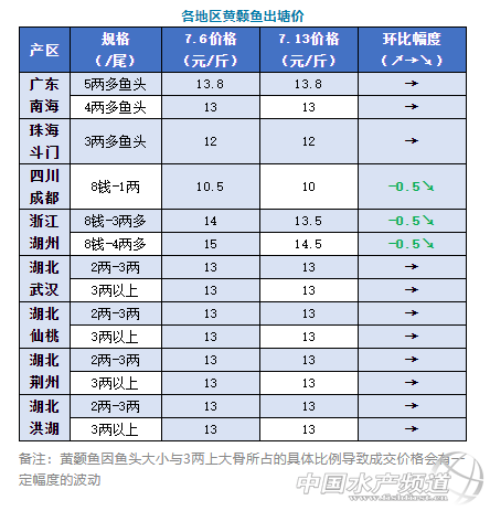 | 中國水產(chǎn)頻道原創(chuàng)報道, 文/圖何氏水產(chǎn)、水產(chǎn)前沿李靜 黃顙魚 1、本周廣東黃顙魚保持穩(wěn)定,5.0兩魚頭報價13.8元/斤;4兩多魚頭報價13元/斤;3兩多魚頭價格12元/斤。近期天氣炎熱,運輸風(fēng)險高,外省水車到本地裝魚有所減少。本地銷量減少,預(yù)計接下來價格或?qū)⒊址(wěn)一段時間。 2、浙江湖州黃顙魚3兩多魚頭價格13.5元/斤,比上周下跌了0.5元/斤;4兩多魚頭報價14.5元/斤,比上周也下跌了0.5元/斤。湖北各地黃顙魚價格保持穩(wěn)定,2-3兩多魚頭價格在13元/斤左右,銷量跟上周也差不多。 |