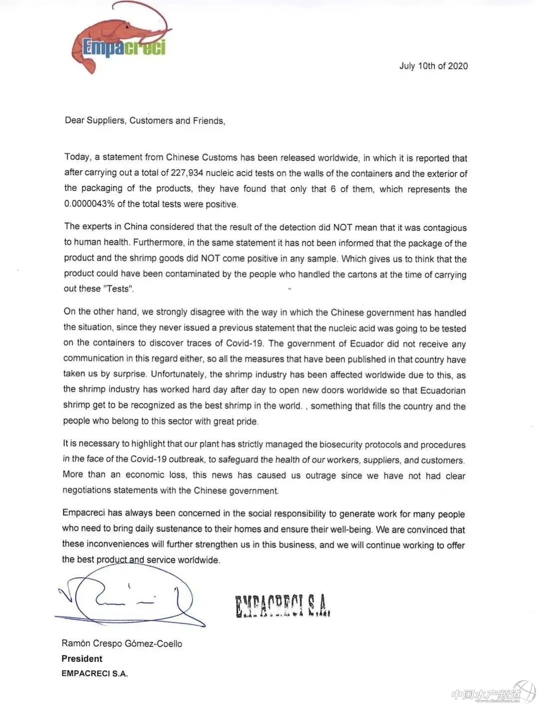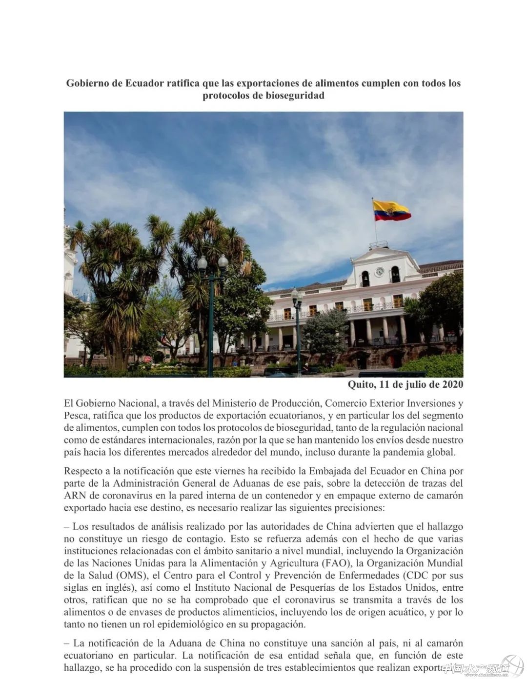 | 中國水產頻道原創報道, 7月13日,厄瓜多爾總統緊急考察涉事工廠,三家封禁企業均作出回應,呼吁業界理性對待! 文/海鮮指南(seafood-guide)李帥 厄當地蝦價暫時并未因封禁事件造成影響 注:以上產品為當地蝦類的塘頭收購價,匯率按當地貨幣實時兌換人民幣計算 (CNY表示人民幣,USD表示美元) 7月14日,海鮮指南收到海外最新蝦價,數據顯示,厄瓜多爾當地蝦價并未因封禁事件造成影響,工廠給出的收購價格依然堅挺,并未繼續落價。 厄總統莫雷諾緊急考察桑塔對蝦加工廠!涉事三家企業均回應! 在7月13日,為檢查厄對蝦是否符合本國和國際衛生安全標準,厄總統莫雷諾于13日上午赴瓜亞基爾市Santa Priscila對蝦加工廠進行實地考察。政府部長羅莫,生產、外貿、投資和漁業部部長翁塔內達以及國家水產養殖協會主席坎波薩諾陪同考察。 厄瓜多爾總統莫雷諾視察桑塔工廠 涉事三家工廠均作出回應! 同日,涉事的三家公司其中的兩家藍泰、太平洋對外公開發布聲明,承諾對外出口的蝦產品符合相關進出口的法律和規定,對安全性有信心。 兩家公司聲明 厄瓜多爾政府確認出口食品符合所有生物安全條例! 7月11日,厄瓜多爾國家政府通過生產、外貿、投資和漁業部,確認厄瓜多爾的出口產品,特別是食品類出口產品,符合國家法規及國際準則規定的所有生物安全條例。正因如此,即便在全球疫情蔓延期間,厄瓜多爾得以始終保持向全球不同市場供應產品。 厄瓜多爾駐華使館本周五收到中華人民共和國海關總署來函,函中告知在厄瓜多爾輸華凍蝦的外包裝和集裝箱內壁上檢出新冠病毒陽性。關于這一情況,有必要明確以下內容: 中國政府的分析結果顯示,這一發現不構成傳染風險。包括聯合國糧農組織、世界衛生組織、美國疾病控制與預防中心和美國國家漁業研究所等在內的一些世界衛生領域的國際機構進一步證實了這一點。上述機構表示,尚未證實新冠病毒能夠通過食品(包括水產品)或食品包裝進行傳播,因此它們在病毒的蔓延中并不起到傳播作用。 中國海關的通知并不意味著對厄瓜多爾的制裁,也不構成針對厄瓜多爾蝦產品的制裁。函中指出,鑒于中厄兩國間的友好關系,病毒檢出陽性后,已暫停三家相關企業的對華出口,而非采取廣泛的禁止措施。 中國海關的信息表明,共檢測樣本227934個,包括產品樣本43964個,內外包裝樣本147568個,環境樣本36402個;結果顯示,1個集裝箱內壁樣本和5個蝦產品外包裝樣本檢出病毒核酸陽性。包括凍蝦蝦體在內的其余檢測結果均為陰性。中國政府專家認為,檢出結果不代表具有傳染性。 水產養殖和漁業副部-質量和安全司持續對該產業的全生產鏈進行控制和監測,確保其嚴格遵守《國家安全計劃》(2006年起生效,與《國際食品法典》和危害分析與關鍵控制點(HACCP)體系相關)、國家緊急行動委員會的《生物安全衛生條例》(關于預防新冠病毒和保障食品安全的指南)和第MPCEIP-2020-0071號部長協議。該協議指出,要“加強必要措施,以符合漁業及水產業的必要程序、條例及其他規范要求,預防和控制漁業及水產業工作人員感染新冠病毒的風險”。 厄瓜多爾國家政府再次表示愿意解決國內外相關管控當局提出的所有關切,以確保厄瓜多爾出口食品的安全和生物安全;重申我國在國際層面同主要貿易伙伴保持的良好關系;并承諾將會一如既往地同中國當局保持密切聯系,配合進行一切必要核查,強化相關進程。 2020年7月11日,基多 生產、外貿、投資和漁業部 厄瓜多爾駐華大使館原文鏈接: |