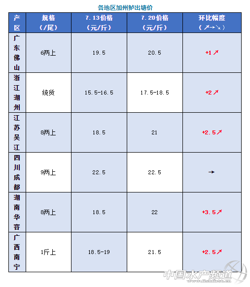 | 中國水產(chǎn)頻道原創(chuàng)報道, 文/圖何氏水產(chǎn)、水產(chǎn)前沿李靜 加州鱸 1、本周加州鱸塘頭價格比上周上漲了1元/斤,開塘價6兩以上20.5元/斤。現(xiàn)在基本出魚都是以6兩上為主,幾乎沒有人出8兩以上的魚。統(tǒng)貨價格會跟據(jù)大魚的成數(shù)略做調(diào)整。隨著北京市場流通放松,北上銷量上升,帶動價格上漲。但受高溫天氣影響,病害頻繁發(fā)生,最近出魚較少。目前佛山地區(qū)存塘主要集中在沙頭產(chǎn)區(qū),但現(xiàn)在規(guī)格好的魚較少,存塘都偏大,大規(guī)格魚流通較困難。目前各地存塘量都在減少,不少養(yǎng)戶看好后市價格,惜售待價。預(yù)計接下來價格或?qū)⑦會有小幅上漲空間。 2、浙江湖州本周統(tǒng)貨報價17.5-18.5元/斤,比上周上漲了2元/斤。具體價格要看魚頭大小和規(guī)格成數(shù)而定。北方市場復(fù)蘇,流通商收魚開始增多,刺激了魚價上升。 3、江蘇吳江本周價格也上漲了2.5元/斤,8兩上報價21元/斤,價格會根據(jù)魚頭大小及規(guī)格比例多少略有調(diào)整。當(dāng)?shù)仞B(yǎng)戶出魚積極性較低,惜售待價心理較增強(qiáng)。 4、四川成都今天報價9兩上22.5元/斤,保持穩(wěn)定。本地存塘量已不多,出魚量少。 5、湖南華容本周價格比上周上漲了3.5元/斤,8兩上報價是22元/斤,當(dāng)?shù)卮嫣亮繙p少,養(yǎng)殖戶賣魚少。廣西南寧本周價格也上漲了2.5元/斤,報價21.5元/斤,近期氣溫較高,出魚量較少。 |