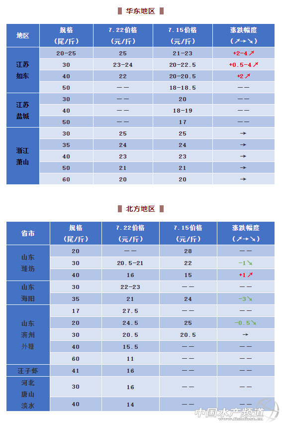 | 中國水產頻道原創報道, 華南40頭蝦均價只有15元/斤!沒蝦沒價虧到哭,有蝦沒價氣到哭,養蝦人只有哭的份? 文/水產前沿 植銀素 本周要聞與行情總結 “今年蝦價有多低?很多人都會用沉默來回復,為什么?不只是跌得厲害,還因為像個無底洞,已經沒有‘底線’可言。”一位在珠海養殖白蝦多年的蝦農無奈說道,現在的白蝦價格是一天一個價,“等蝦價的都哭了。”據了解,今天珠三角地區報價30頭17-18元/斤,40頭14-15元/斤,25頭內的大蝦是“有蝦無價”。因為天氣原因,今年白蝦養殖也是非常不順利,有養殖戶反饋,細心呵護的一口蝦塘一直好好的,一場白撞雨就發白便了,不及時調整又要迫收。而因為價格低迷,部分先前不愿賣蝦的養殖戶現在也要清塘了,因為新投苗的需要分塘。“如今擺在面前的是堵死的路,低價不得不賣,要養活一家不得不繼續放苗。”另一廣西防城港蝦農也說到,但是很多今年新加入養蝦行列的人已經選擇“及時止損”了。7月之后,隨著早造蝦上市,廣西蝦一直處于供過于求的狀態,蝦價每周都在跌1-2元,而高溫天氣、雨水稀少導致今年對蝦發白便異常嚴重,并提前暴發,目前欽州、防城港都表示近8成蝦塘中招,后市亦非常不樂觀。“昨天出的塘底蝦,15頭-40頭都有,統貨價14元/斤,早點出完早點休息算了!”欽州養殖戶無奈表示,今天蝦價對比去年同期至少低8元。 廣西大蝦僅14元/斤 華南蝦價一片唏噓,江浙兩地則因貨源不足穩漲2-3周,今天如東蝦25頭25元,40頭沖到22元/斤,雖然大蝦差價不大,但是40頭蝦的差價達到7-8元/斤,可謂是同蝦不同命。可是,江蘇蝦的漲價,或許還未完!據了解,目前棚蝦幾乎售罄,總量不剩5%,但是今年雨水天氣頻繁,氣溫升高緩慢導致外塘蝦養殖進程落下,目前外塘蝦規格都還非常小,并且從大豐、鹽城到連云港地帶近半外塘蝦暴發弧菌感染,發病特別厲害。從業者預計今年成功率和上市時間都會受較大影響。如此,在未來短時間內江蘇蝦仍會形成一個空檔期,按照目前的價格走勢,持穩可能性非常大! 北方地區外塘大棚蝦偏大規格已經上的差不多了,汪子蝦也開始陸續上市,近段時間價格波動偏快,但是對比上周同期差別不大,后續可能會經歷一輪新的價格下降期。目前銷路暢通,供應京津、青島等市場,汪子蝦較為吃香。 各產區蝦價及分析 |
