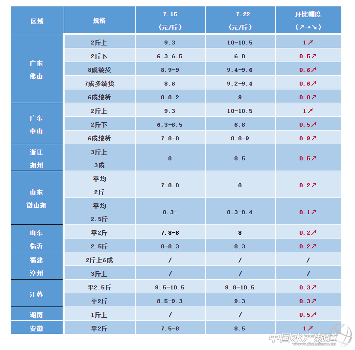 | 中國水產頻道原創報道, 各地存塘下降,供求關系緊張,多地魚價破20! 文/ 水產前沿實習編輯 殷騰蛟 圖/ 杰大飼料 一周行情綜述 時值7月下旬,全國各地加州鱸存塘量日益減少,而北方市場逐步放開,鱸魚需求量增加,各地的舊魚存塘量已經很少,但新魚上市不多,同時越來越頻繁的高溫天氣加大了出魚損耗風險,養殖戶出魚量減少,供求緊張,魚價水漲船高,這又導致部分養戶看好后市,惜售待價。所以總體上,本周養殖戶出魚積極性不是很高,市場流通相對比較緊張。 價格方面,相比于上周各地均有不小的漲幅。湖南、湖北兩地為最,高達3元/斤!可能和前段時間洪水肆虐,養殖戶大量出魚導致現在存塘不多有關。其余各地漲幅均在0.5-1.5元/斤之間。 主產區行情簡析、報價 廣東佛山:佛山6兩上20-20.5元/斤,實際塘頭價需看魚大小發價,新魚需要看魚頭規格而定價,較上周上漲0.5-1元/斤。佛山高溫天氣持續,本地舊魚存塘已經極少,僅在沙頭地區還有部分舊魚存塘,目前小部分新魚達到上市規格,因為高溫出魚風險大,所以部分養殖戶選擇繼續觀望,出魚意愿不高。高溫天氣,病害多發需要控制好養殖風險,臨出魚前后需要做好準備工作減少魚的應激風險,業內人士認為因為暫時新魚上市量不大,后市價格看漲。 浙江湖州:湖州今天統貨報價18.5元/斤,較上周上漲約0.5元/斤,8兩上19元/斤左右。據業內人士反映,當地近期價格變動較大,具體視規格而定。目前菱湖存塘已不多,魚價仍然看漲。 江蘇吳江:吳江8兩上21元/斤,9兩上21.5-22元/斤,七八成魚統貨價在19.8-20元/斤左右。隨著北方市場放開,不少北方的魚車會到吳江拉魚以供應本地市場,但隨著存塘減少以及看好后市魚價,吳江養殖戶惜售者變多,整體出魚積極性比上周有所下滑,魚價穩步上升。有業內人士預測明天9兩上會達22元/斤,8兩上21.5元/斤。 四川成都:成都9兩上報價23元/斤,在過去近一個月以22.5元/斤價格持穩后終于回升0.5元/斤。成都當地存魚較少,養殖戶賣魚不多。之前不少流通商會跑至廣東等地拉魚供應市場,但隨著各地魚價上漲及氣溫升高,流通商利潤空間減少,返回本地及周邊地區拉魚,從而刺激當地魚價上升。不過據反映,目前部分魚塘爛身、花身等情況較多,影響魚價。 湖北武漢:武漢8兩上21-21.5元/斤,相比上周上漲2.5-3元/斤,當地價格較亂。據悉,目前當地老口魚存塘不多,出魚已接近尾聲。不過也有魚中告訴筆者:“今天統貨16元/斤,8兩上20.5元/斤,收魚量大概在30000-40000斤/天。剛剛(22日早晨)一下子來了6輛車,還有5輛在路上,每車能裝6500-7000斤。” 湖南華容:華容今日8兩上報價22元/斤,比上周同期漲了3元/斤左右。當地養殖戶出魚不多,有價無市,部分流通商會在周邊非主產區拉魚以彌補市場供應。水情方面,筆者從當地某位魚中處知悉,近期沒有下雨,對養殖影響不大;但據另一位養戶反映華容縣某處水庫漫溢了一個,部分養殖戶以18-18.5元/斤的價格賣出了不少。 廣西南寧:南寧1斤上報價20.5元/斤,較上周上漲1.5元/斤;8兩上19.5元/斤。當地1斤上鱸魚已不多,而且最近天氣炎熱養殖戶出魚也較少。 |