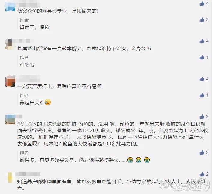 | 中國水產頻道原創報道, 大家要小心、警惕!海盜式+家族式+團伙式偷魚又來,網箱養殖戶被偷到破產 文/ 中國水產頻道 張紅 7月29日晚約十點半,湛江網箱又現瘋狂偷魚賊 “最近幾天,我們在附近的市場上發現一些來歷不明的金鯧魚交易,心存疑問,這些魚是不是偷來的?然后我們就進行圍追伏擊,果然在昨天晚上,十點半左右,偷魚賊被我們抓到了......”在湛江遂溪草潭鎮養殖金鯧魚的藍老板告訴筆者:“由于人手不夠,我們只抓到一條三個人(2男1女),還有幾條船跑掉了,這些偷魚賊實在是太猖狂了!” “去年臺風少、病害少,魚價高,90%的人賺錢,而我幾十個網箱,一共被偷了大概60多萬斤,損失達到1000萬!”藍老板如是說。 死不承認偷魚,抵賴狡辯說從海里捕撈 藍老板稱,被圍堵到的這條船,人臟并獲,船里共有5張大網,其中一張已經偷捕到了300多斤魚,還有一張網被割爛一半丟到海里,可能是盜賊發現暴露緊急處理,估計有200多斤的金鯧魚丟到海里。 “然而,即使如此,這些盜賊卻死不承認偷了魚,狡辯說從是海里捕撈來,我們當場解剖了網里金鯧魚,肚子里還有很多尚未消化的飼料,海里天然魚哪會有一顆顆飼料?他們顯然沒料到這一招,立刻啞口無言!彼{老板稱,在圍堵到盜賊后,他們立刻報警,之后海警趕到,把盜賊控制。 割開被盜金鯧魚肚子,看到未被消化的飼料 猖狂!十點半“搶”魚,盜賊起洋樓,養殖戶卻虧到破產 藍老板告訴筆者,昨晚是在10點半左右就抓到偷魚賊,以往一般是下半夜偷偷摸摸來,像這么早來偷盜比較少見,簡直就是“明搶”,可見其之猖狂。藍老板稱本來以為一共來了三批人三條船,只抓著一條,另兩條逃跑了,但據被抓獲偷魚賊初步口供:“不只我們一家人偷,昨晚共有6條船出來偷魚!比绨幢I賊的口供,只一條船被抓,卻跑了5條船。據知,這些船都是大馬力功率,裝魚多還跑得快。一條船配了5張網,盜賊就往網箱里直接下網偷魚,如果不被發現,一條船可偷可載4-5千斤,6條船偷魚就達2-3萬斤,以目前的魚價11-12元/斤計算,一夜損失就能達到20多萬-30多萬元。 據藍老板稱,早在今年5月份,金鯧魚規格在1-2兩時,已發現被偷魚了,后來加強巡邏,又或者因為當時魚規格小,偷盜者認為圖利不大,在一段時間內,沒有發現偷魚現象。而目前魚已普遍長大,盜賊又開始猖狂!耙呀洷煌岛脦滋炝耍蛲聿欧鼡舫晒Α!彼{先生表示。 據初步查明,偷盜嫌疑人為湛江遂溪草潭鎮舊某村的村民,因去年偷盜獲利豐厚,今年已發展有10多戶,且配備10多條專門偷魚的大馬力做案工具船。目前,不少村民靠偷魚過去了“富足的小康”生活,不少人家里起洋樓,5層洋樓,但不少養殖戶卻被偷到破產...... 據悉,藍老板在金鯧魚養殖業一向比較穩健,養殖態度認真,管理規范,即使是在病害多發的年份,都會有盈利。然而去年他在草潭投資養殖,30多籠,90米周長投苗8萬多,每籠應該產8萬多斤魚,平均1斤多,最終每籠抓魚不超過6萬斤,總共損失60多萬斤魚,去年魚價比今年還要好,預計損失達到1000萬元,十分慘重! 盜賊裝備先進,偷遍華南所有金鯧魚養殖區 據了解,網箱養殖金鯧魚如一個個錢柜遍布茫茫大海,易偷難防,已經成為盜賊的目標,頻頻得手,年年偷遍廣東、廣西、海南幾乎所有的養殖區。在獲得享受的同時,盜賊不斷投入裝備,如飛艇+大船+吊車+大網...堪稱2.0海盜級,十分先進。一分鐘可偷1000多斤,2萬斤魚在20分鐘內即可偷完,不少養殖戶被偷到破產,偷到心臟病發作住院..... 今年3月份,湛江流沙港的陳老板就遭遇了海盜式的偷魚,請看《猖狂!養戶被偷到虧本、心臟病發作!金鯧養殖驚現海盜式偷魚:一分鐘偷1000多斤》,曾引發了網友高度關注! 臺風、小瓜蟲+瘋狂偷魚,天災人禍,養殖戶太難 眾所周知,金鯧魚養殖過程遭遇各種天災威脅,層出不窮的兇猛病害如小瓜蟲、鏈球菌、諾卡氏菌等,還有臺風打擊,養殖戶時刻提心吊膽,再加上盜賊瘋狂偷魚,天災+人禍,本來脆弱的養殖再致沉重的打擊。 藍老板表示,由于去年被偷魚損失慘重,為吸取教訓,今年增加了人手值守網箱,與其他相鄰的2個養殖公司一起,聘請5個工人值守,每人每月工資就要4000元,單單工資就要20000元。但由于養殖水面太寬廣,往往還要加派臨時人員幫助值守,巡邏油費、裝備費等也是不小支出。 “偷魚行徑太惡劣了,輕易獲得不義之財,以至湛江周邊偷魚成風,越來越多人加入偷盜的行列,比臺風、病害的天災對養殖戶的打擊要沉重百倍,我們真是太害怕了。”藍老板心有余悸地表示。 用來偷魚的網具,大部份已被海警沒收,這是匆忙逃跑時割斷剩下的網片 希望把偷盜強之以法,而不是簡單罰款了事 目前,面對越來越猖狂,裝備越來越先進、精良,且演變成家族式、團伙作案,廣西北海鐵山港、湛江流沙港、東海島、海南臨高...沒有哪個養殖海區不被偷得“遍體鱗傷”的,如湛江遂溪草潭鎮舊某村,已有10多戶為家族式偷盜,如果再不及時嚴厲打擊這種犯罪行為,單靠教育+罰款顯然是無力蒼白的,為了補償罰款的損失,盜賊將變本加厲,養殖戶則面臨的更瘋狂被偷盜。 據悉,目前被抓的3人是一家人即是家族式作案,已被送到湛江海警支隊,藍老板希望有關部門嚴厲審訊,一往審出以往更多更嚴重的犯罪事實,并讓盜賊承擔刑事責任。中國漁業協會金鯧魚分會領導對會員單位十分關心,很重視此次事件,彭秘書長對筆者表示,協會將聯系相關金鯧魚行業企業代表,與海