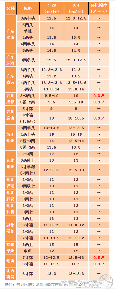 | 中國(guó)水產(chǎn)頻道原創(chuàng)報(bào)道, 天氣悶熱流通減少,市場(chǎng)缺魚(yú),省內(nèi)自銷(xiāo)為主,黃顙魚(yú)價(jià)格穩(wěn)中上漲 文/水產(chǎn)前沿林貞武 一周要聞 要聞1:近期總體來(lái)看,市場(chǎng)存塘量不大,大魚(yú)緊缺,但是受天氣悶熱影響,其中湖北最高一度至39℃,嚴(yán)重影響活魚(yú)運(yùn)輸,市場(chǎng)之間水車(chē)走動(dòng)不活躍,省內(nèi)自銷(xiāo)為主,市場(chǎng)以本地魚(yú)為主,魚(yú)價(jià)出現(xiàn)不同的變化趨勢(shì)。本周四川、湖南分別上漲0.3和0.5元/斤,廣東佛山、江西南昌、浙江湖州、江蘇揚(yáng)州以及高郵、湖北鄂州等地暫時(shí)保持穩(wěn)定。業(yè)界認(rèn)為新魚(yú)沒(méi)那么快上市,按照后市上漲的可能性還是比較大。 要聞2:近期黃顙魚(yú)苗需求量有所增加,黃顙魚(yú)水花進(jìn)入尾批苗階段,湖北部分產(chǎn)區(qū)由于前些天被洪水淹沒(méi)在補(bǔ)苗。湖南常德水花為65元/萬(wàn)尾,但是由于天氣原因成活率較低,100口斤的黃顙魚(yú)苗價(jià)格為15元/斤,廣東佛山產(chǎn)區(qū)水花為90-110元/斤,200口斤為7.5分/尾,300口斤為6.5分/尾,400口斤為5.5毛/尾,上漲0.5毛/尾,川內(nèi)近期放苗少了,得等到9月份之后放幾十上百口斤的秋苗,目前300-1000口斤的苗為0.45毛/尾,湖北鄂州幾百口斤的寸片大概是8分/尾,江西與四川保持同步。 佛山市金浦飼料實(shí)業(yè)有限公司提供 一周行情分析 廣東佛山黃顙魚(yú)本周價(jià)格保持穩(wěn)定。市場(chǎng)存塘逐步減少,由于現(xiàn)在沒(méi)有多少魚(yú)了,加上天氣比較悶熱,路上風(fēng)險(xiǎn)太大,外省水車(chē)不敢過(guò)來(lái)拉魚(yú),目前很多是轉(zhuǎn)省內(nèi)自銷(xiāo)比較多,暫時(shí)價(jià)格上漲的空間不大。雜交黃顙魚(yú)塘頭價(jià)超3.5兩發(fā)價(jià)為12.5-12.6元/斤,4兩魚(yú)頭的塘頭發(fā)價(jià)為13.5元/斤之間,4兩多頭的塘頭價(jià)為14元/斤,5兩頭的價(jià)格為14.5元/斤。魚(yú)中表示近期單性黃顙魚(yú)抓得比較多,單性5兩頭塘頭發(fā)價(jià)14元/斤,4兩多頭單性十三塊多,主要是看魚(yú)定價(jià)。 珠海本周價(jià)格維穩(wěn)。4兩頭塘頭發(fā)價(jià)12.8-13.5元/斤,4兩多頭為14元/斤,情況基本上與佛山類(lèi)似。 廣東清遠(yuǎn)本周價(jià)格維穩(wěn)。清遠(yuǎn)現(xiàn)在存塘規(guī)格魚(yú)較少,零星有出幾塘,現(xiàn)在基本上是看魚(yú)再定價(jià),3兩半頭塘頭報(bào)價(jià)為12.3元/斤,4兩半頭為13.6元/斤,5兩多頭為14.2元/斤。 四川本周價(jià)格回漲0.3元/斤。川內(nèi)前段時(shí)間不漲反跌是因?yàn)轸~(yú)囤多了,結(jié)果又要放苗,就急著賣(mài)導(dǎo)致價(jià)格下跌。外省近期缺大魚(yú),重慶和昆明到川內(nèi)來(lái)拉魚(yú),加上現(xiàn)在養(yǎng)殖戶(hù)苗子基本放好了,不著急出魚(yú),想等價(jià)格,價(jià)格自然回歸穩(wěn)定,而且還有漲價(jià)趨勢(shì)。成都市場(chǎng)日走貨量保持在7-8萬(wàn)斤之間,成都2-3兩的塘頭發(fā)價(jià)為10元/斤,眉山5寸篩發(fā)價(jià)9元/斤,6寸篩發(fā)價(jià)10-10.5元/斤。 浙江湖州本周價(jià)格穩(wěn)定。前些天跌5毛錢(qián)之后,出魚(yú)人有所減少,當(dāng)?shù)剡@幾天魚(yú)價(jià)波動(dòng)不大,大規(guī)格魚(yú)相對(duì)比較缺乏。3兩多炮頭的魚(yú)塘頭發(fā)價(jià)為13-13.5元/斤左右,4兩頭14元/斤,4.5兩頭精品魚(yú)的價(jià)格最高16元/斤。 湖北本周價(jià)格維穩(wěn)。近期氣溫高達(dá)37℃左右,外省車(chē)?yán)~(yú)減少,并且由于溫度太高導(dǎo)致魚(yú)池不好管理,養(yǎng)殖戶(hù)也都想賣(mài)魚(yú),塘頭價(jià)格、批發(fā)價(jià)略有下滑。目前2-3兩的魚(yú)塘頭報(bào)價(jià)12元/斤,3兩上的魚(yú)報(bào)價(jià)為13元/斤,6寸篩12元/斤,7寸篩13元/斤。當(dāng)前武漢白沙洲市場(chǎng)日走貨量大概為5-6萬(wàn)斤左右。 湖南本周價(jià)格上漲0.5元/斤。高溫天氣對(duì)廣州來(lái)湖南的魚(yú)的運(yùn)輸有一定的沖擊,加上廣東黃顙魚(yú)存塘減少,現(xiàn)在走到湖南的廣州魚(yú)少了很多,對(duì)湖南當(dāng)?shù)佤~(yú)價(jià)的影響減小,本地魚(yú)好走。當(dāng)?shù)啬壳按篝~(yú)值錢(qián),6寸篩規(guī)格塘頭報(bào)價(jià)為11.5-11.8元/斤,7寸篩12.5-13元/斤。 福建漳州市場(chǎng)價(jià)格維持穩(wěn)定,二級(jí)魚(yú)12元/斤,3兩上一級(jí)魚(yú)塘頭價(jià)為15元/斤。廣西桂平7寸篩塘頭價(jià)為12.5-13元/斤之間,2-3兩12元/斤。 江西南昌本周價(jià)格維穩(wěn)。近期塘口價(jià)穩(wěn)定,前兩天批發(fā)價(jià)波動(dòng)比較大,目前6寸篩魚(yú)塘頭價(jià)為13-13.3元/斤,南昌市場(chǎng)批發(fā)價(jià)14元/斤,當(dāng)前養(yǎng)殖戶(hù)有點(diǎn)惜售。 江蘇最近價(jià)格有所下跌,雖然目前夠規(guī)格上市的魚(yú)很少,部分區(qū)域有魚(yú),但是浙江魚(yú)到江蘇比較多,其中揚(yáng)州4兩頭魚(yú)塘頭價(jià)14-14.2元/斤,3.5兩頭塘頭價(jià)13.5-13.6元/斤,4.5兩塘頭價(jià)14.5-14.7元/斤,江蘇高郵近兩年增量較大,也有少量可以出塘。 |