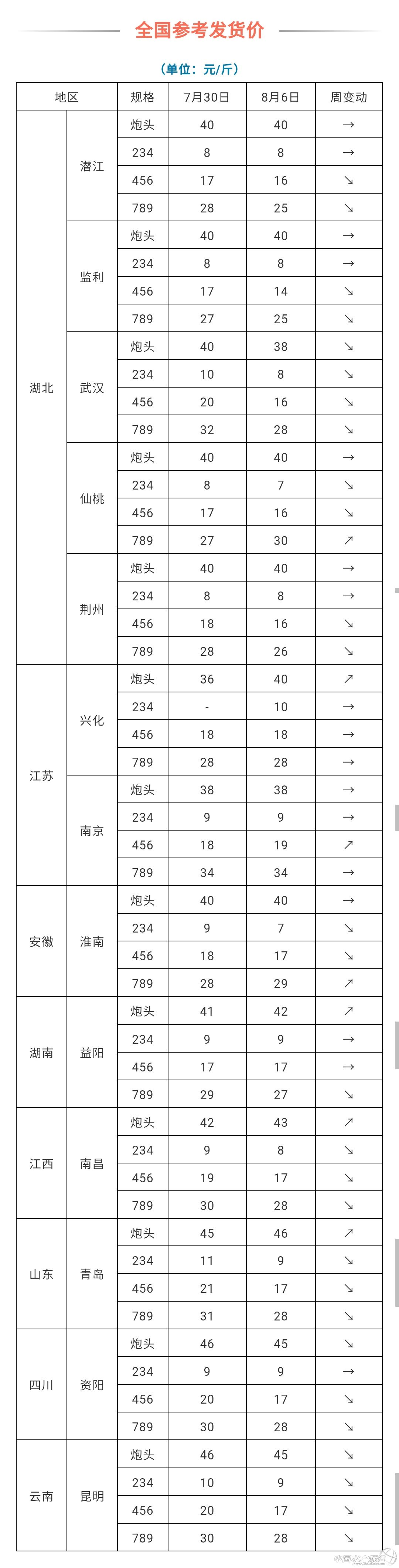 | 中國水產頻道原創報道, 北方今年入汛來最大范圍強降雨 文/蝦蟹前沿實習編輯曾鈴程 山東注意啦,今明天北方強降雨主要集中在山東等地,北方入汛以來最大范圍強降雨仍在持續中,中央氣象臺已經發布暴雨黃色預警: 預計,8月6日08時至7日08時,甘肅東南部、陜西中南部、華北南部、黃淮中北部、四川盆地西部、云南南部、廣西南部等地的部分地區有大到暴雨,其中,河南東部、山東中西部等地局地有大暴雨(100~200毫米)。上述部分地區伴有短時強降雨(最大小時降雨量30~50毫米,局部可超過70毫米),局地有雷暴大風等強對流天氣。建議切斷有危險地帶的室外電源,暫停戶外作業;做好城市、農田排澇,注意防范可能引發的山洪、滑坡、泥石流等災害。 全國降雨量預報8月6日-8日(中央氣象臺) 可是江南地區高溫將愈演愈烈,局地可達40℃以上。這段時期,對蝦蟹養殖來說,也是非常關鍵的階段。前段時間持續的陰雨天,“水癟子”現象高發,好不容易熬了過來,持續的高溫天也非常容易出問題。首先是水草生長被高溫抑制,活力變差,過密過厚,底層水草發黑腐爛。有的人會奇怪為什么這樣好的天氣,池塘還會缺氧,其一就是水草老化,其次水草過密晚上也要大量消耗氧氣。其中最重要的還有底熱引起的缺氧,然后溫度高,水體中的生物量也會非常豐富,加劇氧氣消耗。再加上,攝食強度增大,投料多,也會給水體帶來負擔。所以這段時期,亞鹽、硫化氫等方面是非常需要關注的問題,要注意用菌、底質改良和增氧。 部分塘頭收購價 潛江:小青小紅6元/斤,中青(4-6錢)14元/斤,大青(6錢帶頭)24元/斤,滿肉中紅(4-6.5錢)14元/斤,滿肉大紅(6.5錢上)24元/斤,按質量可浮動。 安徽:456錢13塊/斤,789錢26塊/斤,兩蝦36塊/斤,炮頭43塊/斤。 四川:中蝦18塊/斤,大蝦30塊/斤。 注:編號lxbj2020-08-06 價格如有出入,歡迎底部給我們留言 已上價格僅供參考,請以實際交易價格為準。交易有風險,下單需謹慎! |