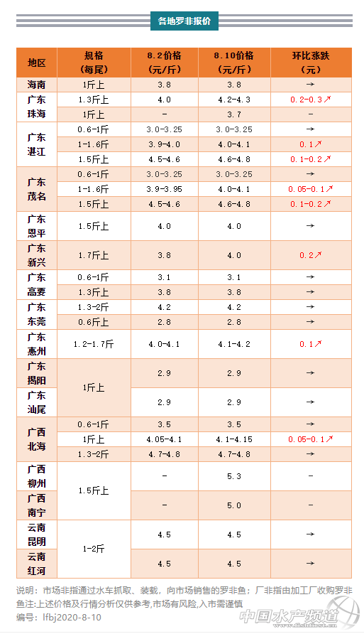 | 中國水產頻道原創報道, 由于行情有持續走高的趨勢,業者認為在9月份放苗養越冬魚的養戶可能不在少數 文/ 水產前沿 葉豐齊 水產前沿專業為你推送羅非魚 最新價格行情及行業新聞、各類資訊。 代表產區羅非魚行情走勢 一周要聞 2020年8月7日起,出口美國的中國原產小規格羅非魚被重新征收25%的關稅。這種規格包裝不超出115克,使用的原料魚基本為9兩-1.2斤的羅非魚,介于6兩-1斤規格小非和1-1.6斤規格中非之間。有加工企業發言人表示,小非一直是公司出口美國市場的優勢產品,恢復加征25%關稅必然對公司既有業務造成一定影響,但是沒有辦法,全體員工要工作、要吃飯,只能邊做邊觀望。 百洋水產集團有限公司運營中心常務副總監黃琨表示,(恢復25%關稅)影響肯定有,但不會是重大的影響。小非是針對美國零售市場部分的,需求始終會有,只是今年上半年(美方)關稅政策的調整促使客戶集中在這個階段收購進口。事實上小非訂單基本出口得差不多了,從7月份開始,已經比較明顯地轉到了中大規格方向,因為出口南美和中東地區的羅非魚也不少,其他國家也有一定的消費需求存在。經過前一段時間的小非出塘,現在氣溫和水量都有一定的好轉,從目前收購情況來看,養殖戶對小非的出魚意愿相比之前下降了不少,加上價格有一定的上浮,更多的是惜售等價,而加工企業更多是針對訂單對收購價格作出調整。 肇慶恒興水產科技有限公司總經理謝海認為,小規格的羅非魚片產品還是消費主流。按照正常情況,超市始終在用此規格的產品,基本上是銷量最大的。哪怕關稅重收,在美國疫情嚴重的前提下,超市還是最佳的購買渠道,大眾的經濟消費都不會太講究,廉價的羅非魚算是一個好的選擇。由于大規格魚價格要更高,而且不太適合家庭消費,小規格自然是最有優勢的。 整體行情綜述 本周多產區羅非魚價格穩定,部分地區行情繼續上調;海南地區各規格羅非魚價格與上周持平;珠三角地區,珠海1斤上廠非3.7元/斤,1.3斤上市場非價格上調0.2-0.3元/斤,新興1.5斤上市場非上調0.2元/斤,高要和恩平羅非價格暫時保持,東莞1.2斤上規格市場非外省車開價上調0.6元/斤;粵東地區惠州1.2-2斤規格羅非價格上調0.1元/斤,揭陽和汕尾地區廠非與市場非行情依舊保持不變;粵西地區湛江和茂名廠非0.6-1斤規格價格不變,1-1.6斤規格廠非價格上調0.05-0.1元/斤,1.3-1.5斤上規格市場非上調0.1-0.2元/斤;廣西地區北海0.6斤上規格廠非價格持平,1斤上規格廠非上調0.05-0.1元/斤,市場非價格暫時穩定,南寧1.2斤上市場非4.5-4.6元/斤,1.5斤上規格5元/斤,柳州1.5-2斤規格羅非5.2-5.3元/斤,欽州、防城港1.2斤上羅非4.5-4.6元/斤,1.5斤上4.8-4.9元/斤;云南地區昆明和紅河羅非價格依然保持與上周一致。 各產地行情分析 海南地區:0.6-1斤規格廠非收購價2.8元/斤,1斤上規格廠非3.8元/斤,皆與上周行情一致,而1斤上規格塘頭現金收購價3.5-3.6元/斤,同上周。西線市場1斤上市場非塘頭價3.5-3.6元/斤,保持上周行情。 珠三角地區:珠海1斤上廠非3.7元/斤;1.3斤上規格市場非4.2-4.3元/斤,環比上周上調0.2-0.3元/斤;而5-9斤大羅非塘頭價8.5元/斤,保持上周行情。東莞1.3-2斤以上規格水車走珠三角市場羅非塘頭價4.2元/斤,同上周價格;而6兩上廠非2.8元/斤,依然維持上周行情;外省車抓1.2斤上統貨4.2元/斤,環比上周上調0.6元/斤。恩平1.5斤以上規格市場非4元/斤,同上周價格,工廠非6兩上2.8元/斤,1斤上3.8元/斤,皆與上周行情一致;新興1.7-1.8斤上規格市場非到手價4元/斤,環比上周上調0.2元/斤,一車普遍裝5千斤左右,與其他品種一并出魚,水車也較多,整體來說比之前好市,2-3斤上市場非3.9-4元/斤,暫同上周價格。肇慶1.3斤上市場非塘頭價3.8元/斤,0.6-1斤規格廠非2.6-3.1元/斤,1-1.6斤規格3.55元/斤,1.6斤上3.3元/斤,皆與上周行情一致。 粵東地區:惠州1.2-2斤規格走本地市場羅非早上車4.1元/斤,下午車4.2元/斤,環比上周皆上調0.1元/斤。揭陽和汕尾1斤以上規格廠非(走汕尾本地凍廠)塘頭價2.9元/斤,1-1.2斤上規格市場非3.3-3.4元/斤,暫時仍保持上周價格。 粵西地區:規格魚短缺,使得市場非價格上調,養戶開始增加投喂,計劃養大魚走市場,而大規格廠非出現缺貨性漲價。湛江、茂名兩地1.3斤抓起,普遍抓到1.7斤上規格市場非4.6-4.8元/斤,環比上周上調0.3-0.4元/斤。加工廠方面0.6-1斤規格廠非3-3.25元/斤(2.95起加3成3.05,4成3.15,5成3.25),保持上周行情,不過據悉有些廠開價3.3-3.4元/斤;1斤上規格,湛江和茂名4-4.1元/斤,環比上周上調0.1元/斤,1.6斤上規格超50%收購價甚至可去到4.4元/斤,而藥殘僅扣錢不拒收。 廣西地區:魚價上漲后,養戶現在不太著急出魚,一邊觀望等價,一邊加緊喂料養大規格,市場暫時較為缺魚,估計后市魚價還有上調空間。另外,前期魚價低迷時許多養戶控料,一些水花苗如今剛達到中非規格,由于行情有持續走高的趨勢,業者認為在9月份放苗養越冬魚的養戶可能不在少數。北海0.6-1斤規格廠非最高3.5元/斤,保持上周價格,1斤上規格廠非4.1-4.15元/斤,環比上周上調0.05-0.1元/斤,市場非1.2-2斤4.3元/斤,1.7斤上4.7-4.8元/斤。南寧1.5斤上規格稍大規格羅非基本缺貨,大約5元/斤,目前由1.2斤抓起4.5-4.6元/斤。而柳州1.5斤上規格羅非5.2-5.3元/斤。欽州、防城港1.2斤上規格4.5元/斤,拉網4.6元/斤,1.5斤上規格4.8-4.9元/斤。 云南地區:西雙版納產區現在處于新老魚交替階段,舊魚存塘量不多,約占市場