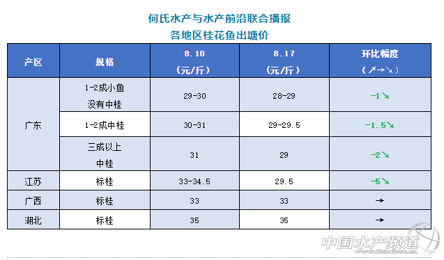 | 中國水產(chǎn)頻道原創(chuàng)報道, 文/圖何氏水產(chǎn)、水產(chǎn)前沿李靜 桂花魚 本周廣東鱖魚銷量沒有好轉(zhuǎn),價格持續(xù)下滑,1-2成小魚沒有中桂開塘28-29元/斤,比上周下跌了1元/斤;1-2成中桂開塘價29-29.5元/斤,比上周下跌了1.5元/斤;三成以上中桂價格也是29元/斤,比上周也下跌了2元/斤。目前存塘舊魚還有很多,但大多數(shù)都偏瘦小,流通商超29元/斤以上不看魚。部分前期訂的新魚也開始陸續(xù)上市,前期訂的價格最高34元/斤左右,流通商虧損嚴(yán)重。發(fā)病的新魚以丁小魚為主,賣16-17元/斤左右。受此影響小魚價格下滑較為顯著,標(biāo)魚、大魚影響不大。預(yù)計接下來價格或?qū)⒗^續(xù)下行。 外省三大產(chǎn)區(qū)的鱖魚已經(jīng)沒有多少舊魚了,近期新魚發(fā)病非常嚴(yán)重。江蘇地區(qū)標(biāo)桂報價29.5元/斤,比上周下跌了5元/斤。湖北產(chǎn)區(qū)報價35元/斤,廣西桂魚本周報價33元/斤,當(dāng)?shù)乩萧~基本上結(jié)束了,現(xiàn)在也有部份偏小新魚出,價格也不高。 |