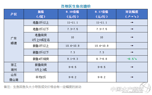 | 中國水產頻道原創報道, 文/圖何氏水產、水產前沿李靜 生魚 1、本周廣東生魚塘頭價格基本穩定,塘頭報價老魚2斤以上11-11.1元/斤;2斤以下報價7.3-7.5元/斤;老魚統貨2斤上8成左右報價10元/斤;新魚4斤統貨8.7-8.8元/斤,比上周下跌了0.5元/斤;2斤上報價10.6-10.8元/斤;2斤以下報價7.3元/斤,跟上周一樣。每塘魚的最終成交價格都是根據魚頭大小以及2斤以上成數來決定的。目前存塘量越來越少,大數成數越來越高,中小魚成數較少。預測后期價格還會有小幅下滑,但幅度不會那么大,銷量變化不大。 2、浙江湖州本周新魚統貨3斤上3成左右報價9-9.5元/斤,保持穩定。山東微山湖產區本周價格保持穩定,平均2斤報價9-9.2元/斤,銷量跟上周也差不多。 |