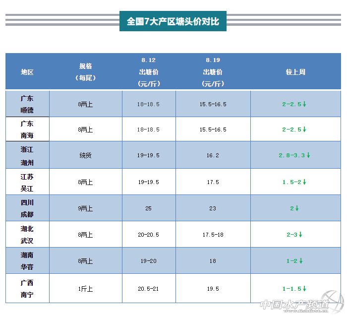 | 中國水產頻道原創報道, 四川、廣東暴雨,消費市場疲軟,新魚繼續上市,魚價持續下跌 文/ 水產前沿實習編輯 殷騰蛟 圖/ 杰大飼料 一周行情綜述 一周以來,各主產區在新魚的沖擊下價格繼續下跌,佛山地區跌幅明顯,較上周跌2-4元/斤,其他地區多在1-3元/斤左右。四川有少量新魚上市,同時因暴雨原因市場消費能力降低,魚價較上周回落2元/斤。 另外,今早6點左右臺風“海高斯”登陸廣東省珠海市金灣區沿海,受其影響,18日中午以來,廣東東南部、海南島北部等局地出現暴雨或大暴雨;廣東中東部、江西南部、福建南部等地出現8級~10級陣風,廣東珠江口沿海等局地11級~15級。“海高斯”還將繼續影響華南,廣東中部沿海風力大、華南還將有強降雨。今早就有養殖戶反映,強風對出魚造成了不小影響,中午風勢已有所緩和。 主產區行情簡析、報價 廣東佛山:佛山8兩上老魚報價15.5-16.5元/斤,新魚6兩上在12-13.5元/斤,7-8兩捉上13.5-14.5元/斤左右,目前價格比較混亂沒有統一標準,實際的塘頭價錢還是看魚頭大小和上車規格大小而定。一周以來佛山周邊地區的養殖戶出魚積極性較高,導致魚價持續回落。今天中午沙頭地區有養殖戶告訴筆者:“今天走量一般,不少養殖戶因為現在價格太低以及花身和超大魚問題被砍價較多而推掉了訂單。”也有魚中反映,今天出魚的養殖戶仍是較多,不少人還是擔心價格進一步下滑。此外老魚花身、超規格情況現在也比較常見,據悉有的塘甚至壓到12元/斤左右。同時近期臺風暴雨比較頻繁,佛山等地受影響較大,養殖戶出魚或有不便,還需提前。 浙江湖州:湖州統貨價16.2元/斤,較上周跌2.8-3.3元/斤。存魚很少,當地交易量不多,部分流通商可能會去吳江拉魚。 江蘇吳江:吳江大統貨實際成交價16.2元/斤,8兩上17.5元/斤,當地幾乎都是以統貨出魚,價格較上周跌0.8-1.8元/斤。據當地流通商周老板介紹,目前賣魚的養殖戶比較多,一天的出魚量在2-4萬斤波動。總體上還是處于一種供過于求的狀態,當塘魚超標太多時,養殖戶就更加難出手。 四川成都:成都9兩上23元/斤,較上周跌2元/斤。近期四川連續暴雨,樂山及眉山部分地區受災較嚴重,但據當地養殖戶透露,鱸魚方面受災損失較小。受暴雨影響,消費者出門不便,市場疲軟;同時部分新魚也開始陸續上市,導致魚價下滑。 湖北武漢:武漢8兩上17.5-18元/斤,較上周下跌2-3元/斤。前段時間當地氣溫較高,養殖戶出魚不多,主要是老口魚,近期走量略有回升,有業內人士估計新口魚可能要至月底或下月初上市。 湖南華容:華容8兩上18元/斤,較上周跌1-2元/斤。當地還有少部分存塘,雖然每天都有養戶出魚,但走量并不大。 廣西南寧:南寧網箱1.1斤上報價19.5元/斤,較上周回落1-1.5元/斤。廣東魚價持續下滑對當地造成了不小的壓力,近期養殖戶出魚不多。 |