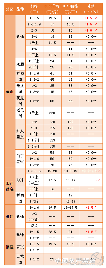 | 中國水產頻道原創報道, 養殖戶望眼欲穿!各地珍珠斑終于迎來不同幅度的上漲 文/ 水產前沿 實習編輯 吳寧靜 行情簡析 海南地區:因受到臺風的影響,本周海南規格珍珠出現小幅上漲,最高上漲1.5元。紅東星斑價格已經恢復至年初高價,1.3斤以上更是有的售到135元/斤;但業內人士認為紅東星斑后市上漲空間十分有限。 廣東地區:本周廣東珍珠斑出現較大波動。筆者從湛江從業者得知,因臺風“海高斯”海南停航,對本地石斑需求較大,周二珍珠出現上漲至20元/斤,周三是20.5元/斤,今天復航就又回落到19.5元/斤;陽茂從業者也表示規格魚略微上漲,但養殖戶出魚不多,多以2斤以上出魚,再加上臺風影響,陽江、茂名連續下雨,有不少塘口出現爛身現象。此外,臺風過后水環境變化大,養殖戶要注意預防爛身。 福建地區:本周福建也帶來了好消息。小珍珠飆漲1.5元/斤,在經歷兩個月的跌價后,目前福建珍珠價格超過了6月初的22元/斤,沖至22.5元/斤。主要還是因為疫情沒有宴席,終端消費不起來。但業內人士預計,隨著休漁期結束,消費者對海鮮的需求上漲,極有可能帶動石斑魚消費,出現漲勢。 本周各地石斑魚報價 特別感謝:海南晨海水產有限公司、海南大順發水產有限公司、 中泰水產批發行、萊州明波水產有限公司、廣東上上生物科技有限公司、廣東大順發水產有限公司、福建藝祺水產養殖有限公司、涌益水產專業合作社對本文大力支持!(本文轉自【糧油信息網】。如有版權問題,敬請聯系wx@fishfirst.cn。) |