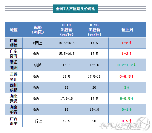 | 中國水產(chǎn)頻道原創(chuàng)報道, 廣東、南寧、吳江魚價上漲,老魚存塘減少,養(yǎng)戶惜售 文/ 水產(chǎn)前沿實習(xí)編輯 殷騰蛟 圖/ 杰大飼料 一周行情綜述 本周以來,廣東主產(chǎn)區(qū)老魚價格回升1-2元/斤,新魚價格止跌,此外,吳江、南寧都漲了0.5元/斤左右。其他地區(qū)仍有不同幅度的下跌,成都跌3元/斤,當(dāng)?shù)匦卖~上市量逐漸增多,而且暴雨過后市場還比較疲軟,導(dǎo)致魚價跌幅較大。 主產(chǎn)區(qū)行情簡析、報價 廣東佛山:佛山6兩上舊魚報價17.5元/斤,正價圍數(shù),一般17元/斤左右走車;新魚價格在13.5-15元/斤,本周以出7兩上規(guī)格為主,7兩上價錢會略高,實際塘頭價需圍魚后,根據(jù)魚頭大小,按實際上車規(guī)格確定,定價有所浮動。當(dāng)?shù)亓魍ㄉ谈嬖V筆者:“現(xiàn)在養(yǎng)殖戶對老魚惜售,江門、肇慶、佛山三水高明當(dāng)?shù)氐男卖~出魚較為積極,價錢有回升,一般夠大就馬上賣了。”在咨詢了其他魚中后,也有人反映,“今天舊魚16.8元/斤,無超大、無花身。”近期高溫加上老魚存塘減少導(dǎo)致了此次魚價回升,后市在部分養(yǎng)戶惜售老魚的情況下,魚價可能還會有所上漲。 浙江湖州:湖州統(tǒng)貨15-16元/斤,較上周下降0.2-1.2元/斤,具體價格視整體規(guī)格而定。當(dāng)?shù)亟灰琢坎淮螅峡隰~所剩不多,新口魚還需要一段時間才能上市。 江蘇吳江:吳江統(tǒng)貨16.5元/斤,較上周同期漲0.3元/斤左右,超標(biāo)魚價格可能不到16元/斤;8兩上標(biāo)魚報價17.5-18元/斤。據(jù)當(dāng)?shù)亓魍ㄉ谭从常裉焓蒸~大概有1.8萬斤,目前養(yǎng)殖戶出魚量還是很多,供過于求。也有養(yǎng)殖戶告訴筆者,近期市場比較混亂,自己準(zhǔn)備今天賣3萬斤,多了賣不掉。此外,受北京海鮮市場停業(yè)整改影響,鱸魚北上困難,部分流通商近期沒有收魚。 四川成都:成都9兩上20元/斤,較上周下降3元/斤,一周內(nèi)跌幅較大。當(dāng)?shù)匦卖~陸續(xù)上市沖擊了魚價,同時前段時間暴雨后,市場消費(fèi)力恢復(fù)緩慢。預(yù)計后市價格受新魚影響仍將下跌。 湖北武漢:武漢8兩上17.5元/斤,較上周下跌0-0.5元/斤。老魚存塘不多,新魚少量上市,但因為近期溫度較高,市場上走量一般。 湖南華容:華容8兩上17-18元/斤,較上周最高跌1元/斤。當(dāng)?shù)厥袌鲎吡恳话悖峡隰~存塘逐漸減少,有魚中估計下月底新魚才能大批上市。 廣西南寧:南寧1斤上鱸魚20元/斤,較上周漲了0.5元/斤,8兩上鱸魚17元/斤。當(dāng)?shù)卮笠?guī)格鱸魚較少,塘頭價也相應(yīng)較高,部分養(yǎng)殖戶惜售;同時由于高溫,當(dāng)?shù)爻鲷~也比較少。 |